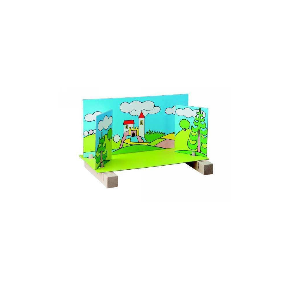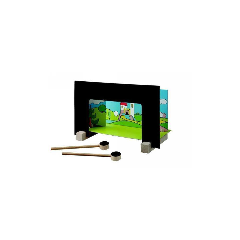 Magnetické divadlo Hrad obsahuje podstavce, dvoje kulisy z tvrdého papíru, dvoje vodící hůlky v a 5 dřevěných figurek. Ve figurkách je vlepený magnet který se přitahuje k magnetu ve vodítku.