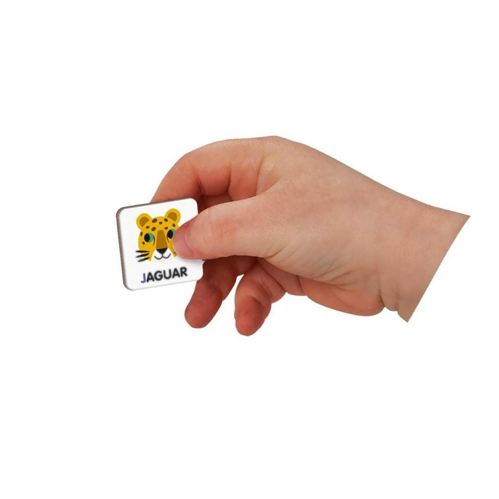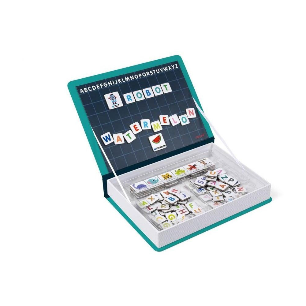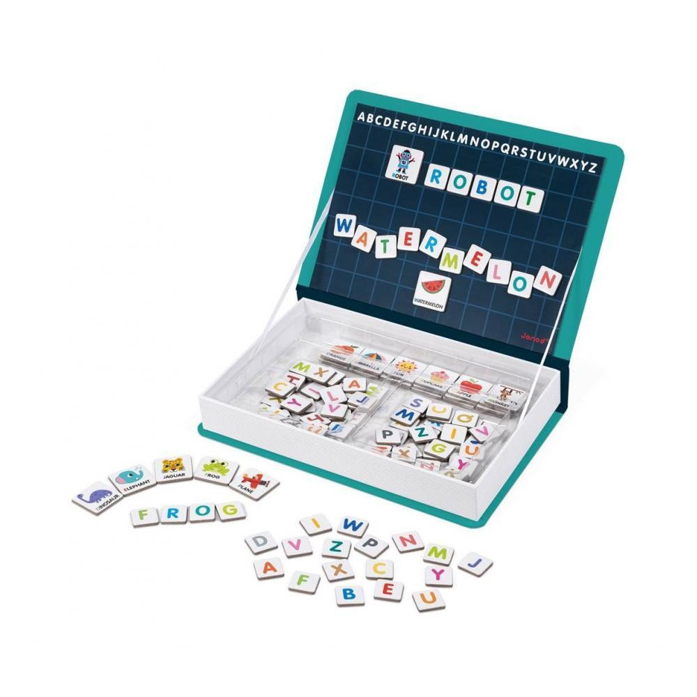 Magnetická kniha Magneti'Book English abeceda je úžasná naučná hračka vhodná pro děti od 3 do 8 let. Skládačka s písmenky je plná barev, proto se s ní děti budou rady hrát i učit nové písmenka a slovíčka. V předloze jsou různé předměty a zvířátka s obrázky a tiskacími písmeny. Menší děti na základě obrázku mohou říkat, co na obrázku vidí a rodič může název vyskládat z písmenek česky i anglicky. Větší děti to už zvládnou samy. Mohou si vymyslet i vlastní slova nebo si dodělat vlastní kartičky. Magnetická vzdělávací hračka obsahuje 26 kartiček s předlohami a 104 písmen. Praktické balení zajistí, že se hračka dá pohodlně přenášet, děti se s ní zabaví nejen doma, ale i na dlouhých cestách. Skládá se z 26 obrázkových magnetů a 104 písmenových magnetů. Materiál: karton, magnet Rozměry: 19 x 4 x 26 cm