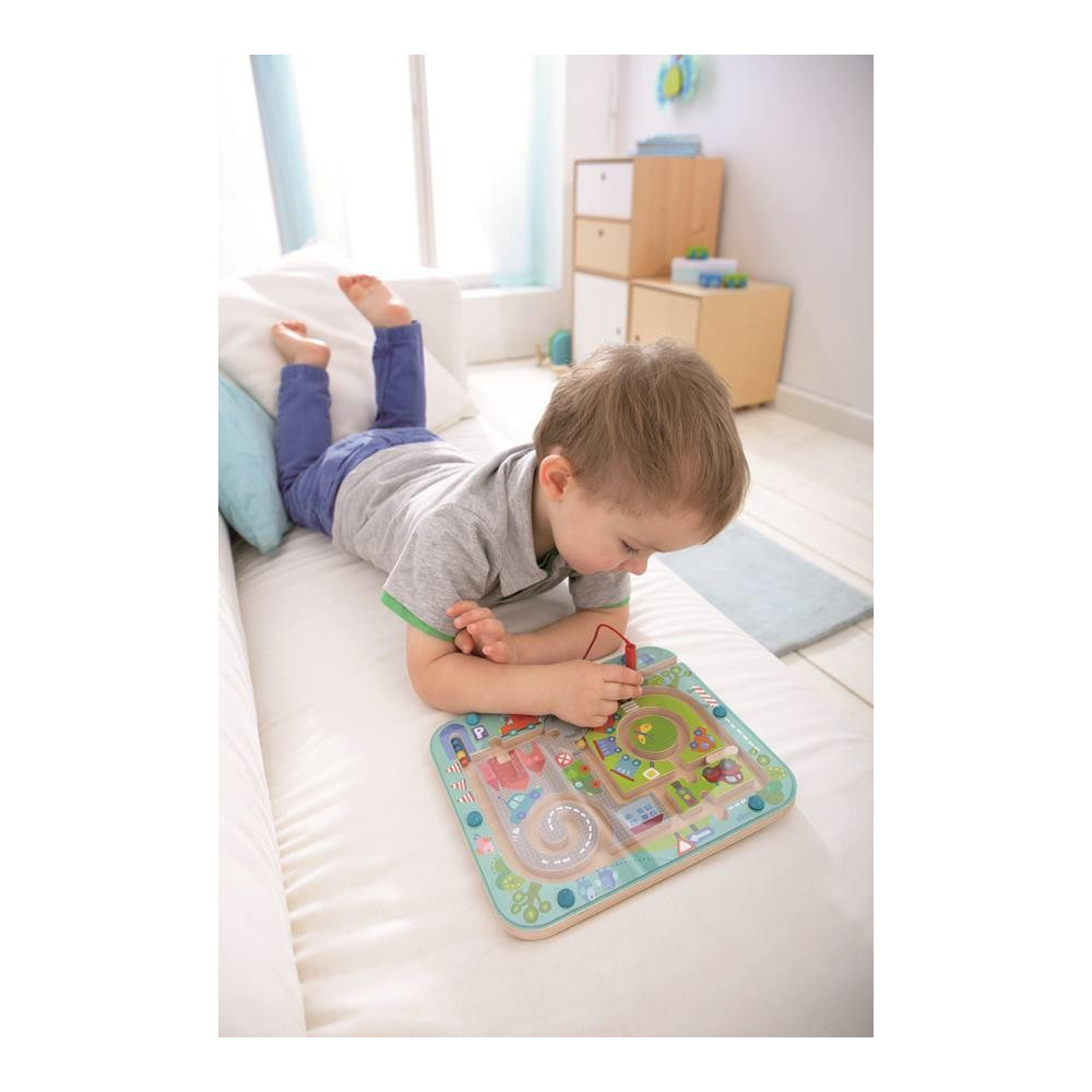 Drevený labyrint s guľôčkami, v ktorom je potrebné pomocou paličky s magnetom previesť guličku cestičkami rušného mesta do správneho domčeka, rovnakej farby.Tento guľôčkový labyrint od nemeckého výrobcu firmy Haba, šikovným spôsobom naučí chlapcov aj dievčatá schopnosť koncentrácie, trpezlivosti a zlepší ich jemnú motoriku.