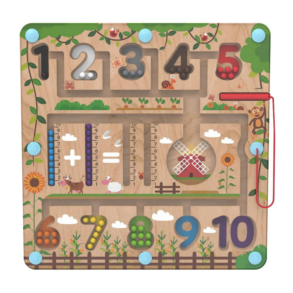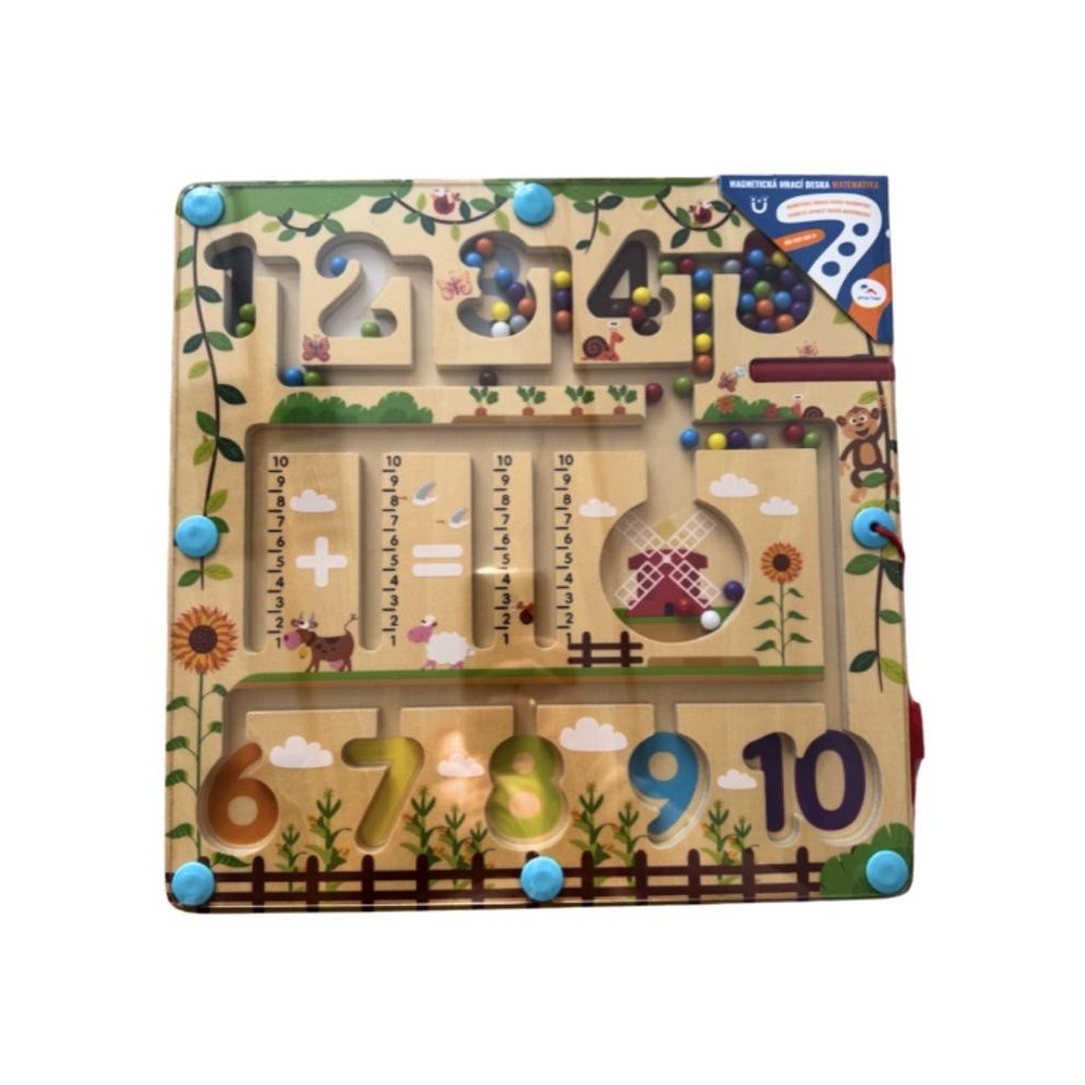 Vydejte se na cestu přírodou s barevnými kuličkami. Provedete úspěšně různobarevné kuličky všemi zákoutími? Umístíte všechny do mlýna? Vejdou se tam? Nebo pomocí čísel na metru vytvoříte a vypočítáte příklad? K vedení kuliček se při hře využívá magnetické ukazovátko, které prověří dětskou trpělivost a koordinaci rukou a zraku. Dokážete pak navrátit kuličky zpět na své místo podle barvy? Je počet kuliček stejný jako číslo, do kterého jste je umístili? Zábavná dřevěná hra, která pomáhá dětem rozvíjet jemnou motoriku, orientovat se v prostoru a rozšiřovat slovní zásobu pojmenováváním barev a předmětů ve městě. Děti se také učí počítání zábavnou formou. Dřevěná základna v designu přírody je kryta odolnou průhlednou plastovou deskou, hračka je díky tomu bezpečná. Hlavní vlastnosti: úvod do světa počtůrozvíjí motorické dovednosti dětí zábavné i bezpečné díky magnetickému principu
