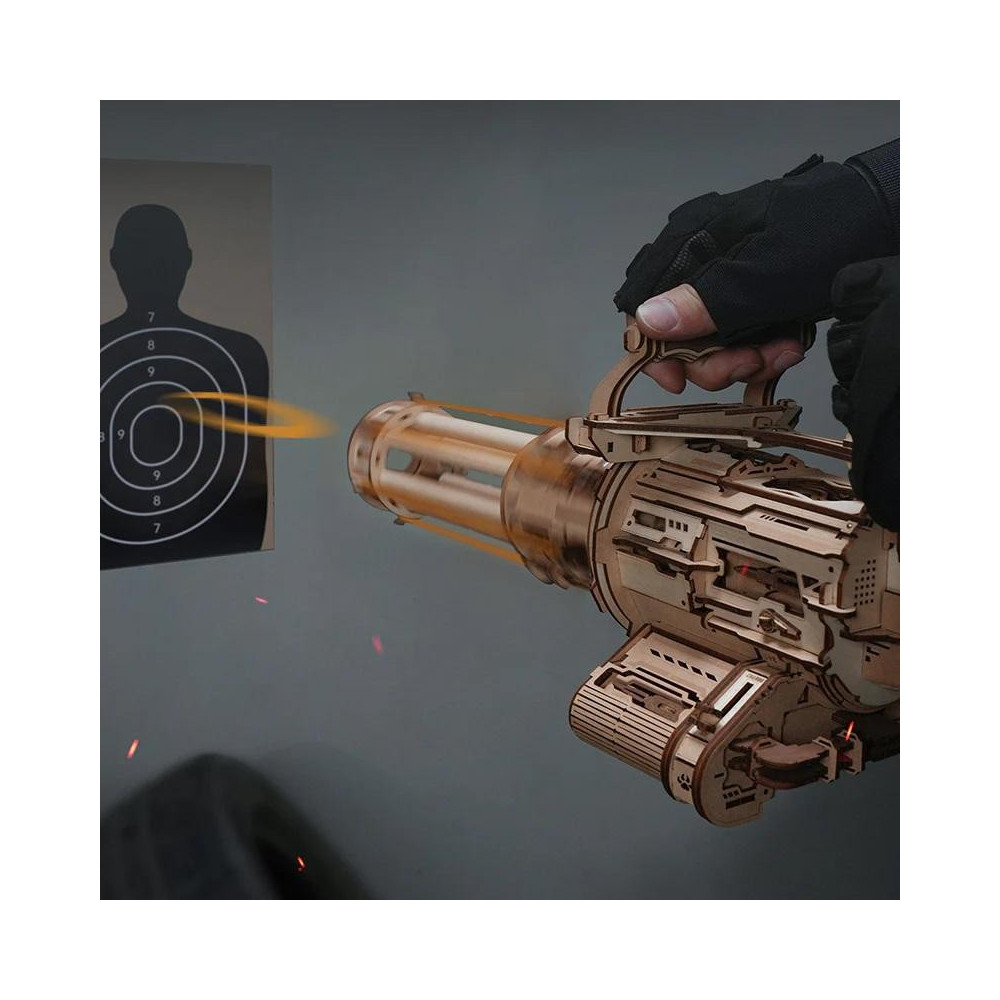 Připravit, sestavit, zaměřit, střílet! Rozprouděte si krev. Máte dostatek adrenalinu pro tuto otočnou, cvakající a střílející obouruční zbraň? Kulomet s otočnou hlavní ROKR je 3D dřevěná puzzle zbraň, jejímž vrcholem je šest otočných hlavní, z nichž každá dokáže vystřelit šest gumiček. To je 36 vysokorychlostních ran, které můžete nabít na odnímatelnou sestavu otočné hlavně. Tato kráska, inspirovaná modelem XM556, naučí fanoušky leccos o mechanice rotačních kulometů, aniž by přitom měla masivní hmotnost. Také se vyhýbá zranění živých cílů tím, že jako střely používá gumičky. Staňte se svým vlastním akčním hrdinou a objednejte si ten svůj ještě dnes! Tato stavebnice technického modelu je skvělým prvkem v jakékoli sbírce, ať už jde o vystavení nebo jako dárek pro nadšence do hraček a filmů či vojenské veterány po celém světě. Šestihlavňový kanón má jednoosý synchronizovaný systém řízení palby, který jako munici používá gumové pásy. Každá ze šesti hlavní pojme šest gumových pásů pro celkem 36 výstřelů, poháněných účinným převodovým mechanismem. Pro rovnoměrné napnutí a plynulou střelbu vkládejte munici jednu po druhé a otáčejte hlavní, dokud všechny hlavně nebudou mít 6 gumiček. Přední spoušť otáčí hlavní a světlem ohnivého draka, zatímco horní spoušť spouští gumičky pro dvojnásobnou zábavu a akci. Hlavní vlastnosti: 412 přesných dílkůsnadná montáž bez použití lepidlatěžká obtížnost sestavenírychlý, ale bezpečný systém střelby36 rychlopalných střelodnímatelná hlaveňjedinečný dekorační prvekvhodné jako sběratelský prvek
