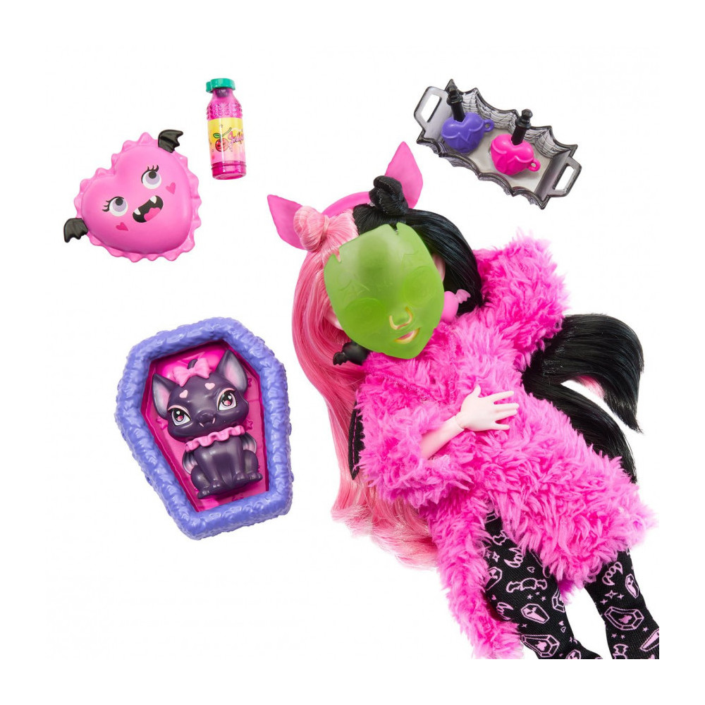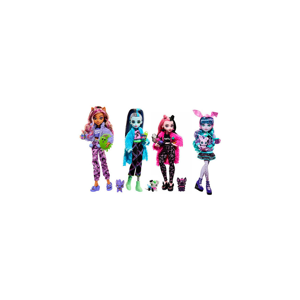 Samozřejmě, že na každé přespávačce se holky parádí a převlékají... ale když k tomu přidáte knihy kouzel a lak na drápy, je to opravdu strašidelný večírek! Monster High™ představuje Creepover Party™, kolekci panenek příšerek s tematickými doplňky, které inspirují k vyprávění příběhů a děsuplným módním hrátkám. Každá panenka Monster High™ přichází s neotřelým vzhledem, nezbytnostmi pro přespání a domácím mazlíčkem.