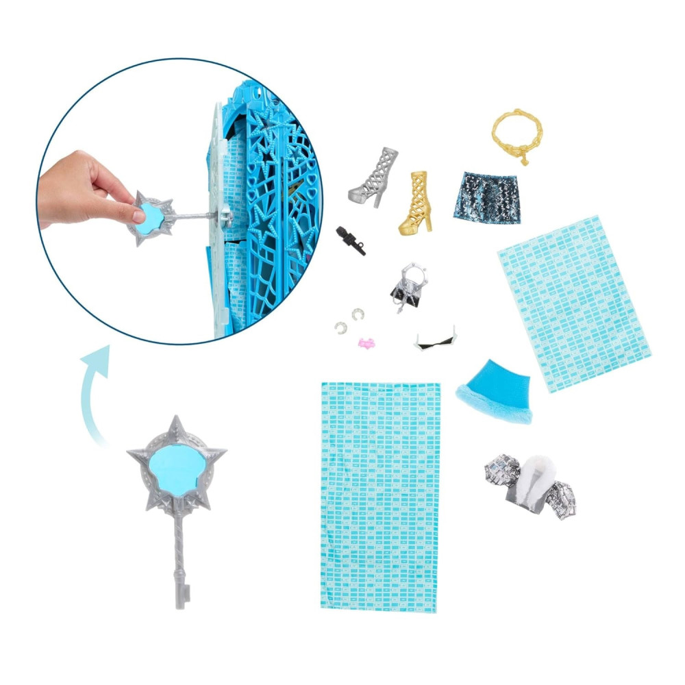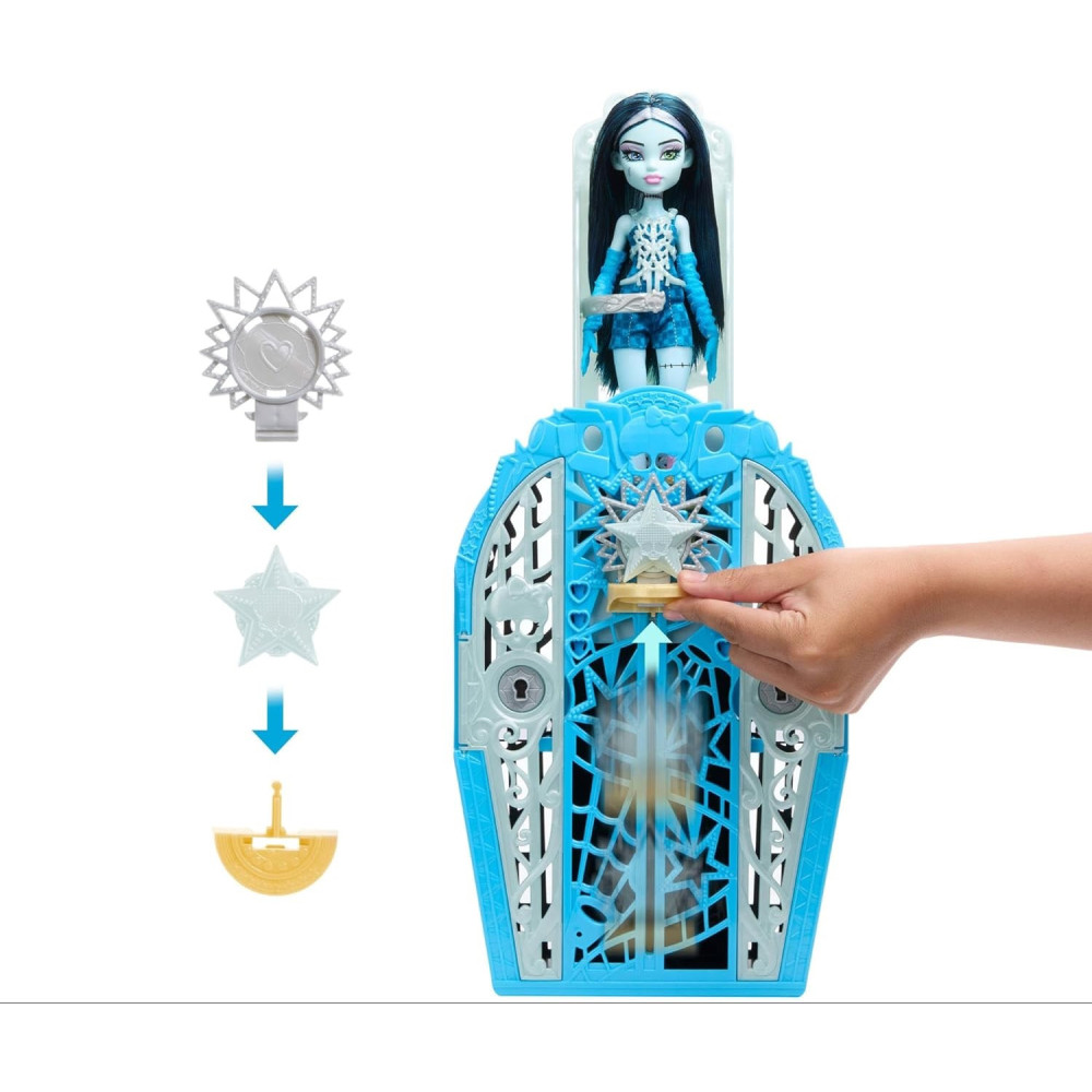 Odhalte tajemství Hauntlywoodu s Monster High! Vyřešte záhadu, otevřete brány Hauntlywoodu a odhalte kloubovou panenku Monster High. Děti se mohou stát strašidelnými detektivy a hledat stopy na mapě pomocí „kouzelného“ zvětšovacího klíče. Po cestě je čeká více než 19 úžasných překvapení, včetně třpytivých oblečků, děsivých rukavic a oslnivého šperku. Po skončení hraní si děti mohou uklidit monsterku, oblečení a doplňky do hvězdného šatníku, který je ideální nejen pro ukládání, ale i pro vyprávění příběhů.