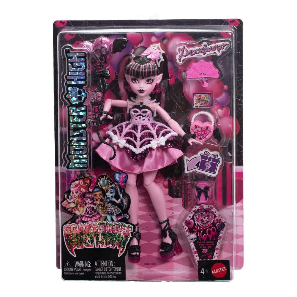 Draculaura pořádá děsivě sladkou narozeninovou párty – a její kámošky z Monster High míří na tuhle oslavu století! Není každý den, kdy monsterka slaví 1600. narozeniny, takže co jiného by se hodilo víc než pořádná párty? Každá panenka z této kolekce je oblečená do parádně děsivého outfitu a přichází s balónky, pozvánkami, narozeninovými přáníčky, dárky a dalšími doplňky. Díky tolika cool doplňkům je jasné, že tahle párty bude neuvěřitelná!