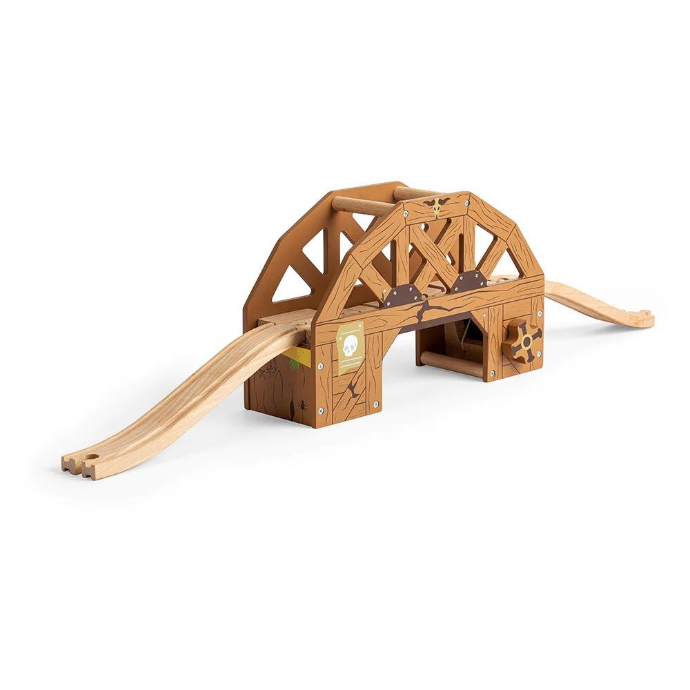Kovbojové a kovbojky si užijí mnoho zábavy s tímto dřevěným mostem v tematice divokého západu. Vlaky vyjedou na most, ale dostanou se bezpečně na druhou stranu? Otočte kolem a most spadne! Interaktivní doplněk vláčkodráhy pro všechny vlakové nadšence. Hraní s vláčkem a otáčení kola rozvine dětskou motoriku a koordinaci ruka-oko. Obsahuje dva kusy stoupající a klesající koleje.