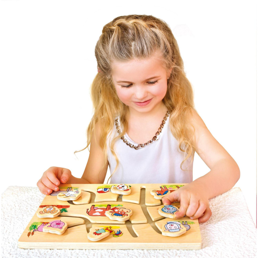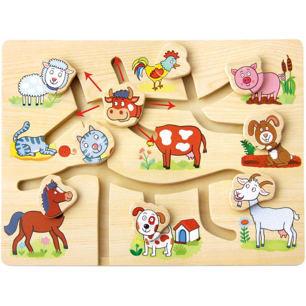 Jednoduché bludiště pro nejmenší, které hravou metodou podporuje psychomotorický vývoj dítěte a učí poznávat domácí zvířátka. Vyrobeno z lehké a odolné překližky.