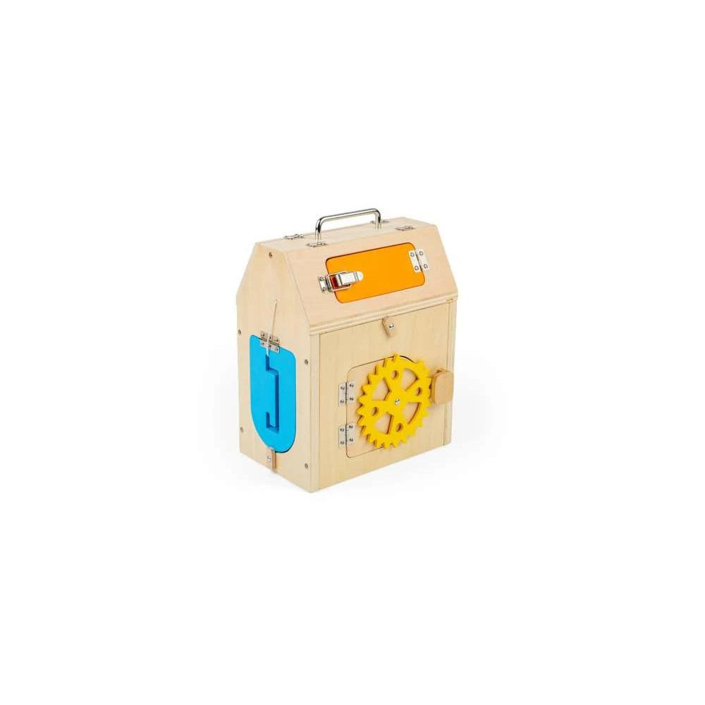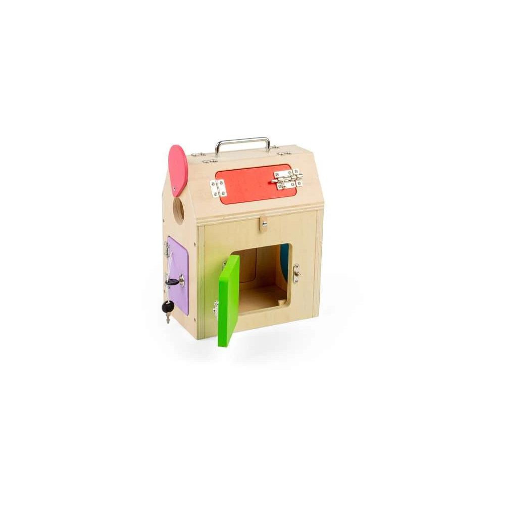 Různé zámky a labyrinty. Tento kufříkový domeček přináší spoustu zábavy, díky které bude moci Vaše dítě rozvíjet svou zručnost, zvídavost a zejména jemnou motoriku. Učí děti logickému myšlení a vytrvání ve výzvách. Funguje také jako praktický uložný box. Splňuje všechny aktuální evropské bezpečnostní normy. Barveno netoxickými barvami a laky.