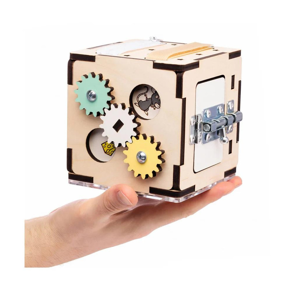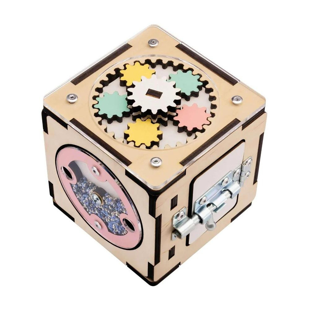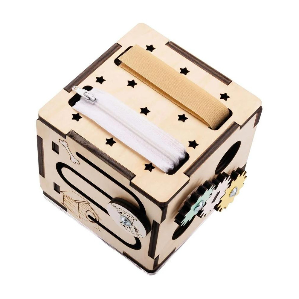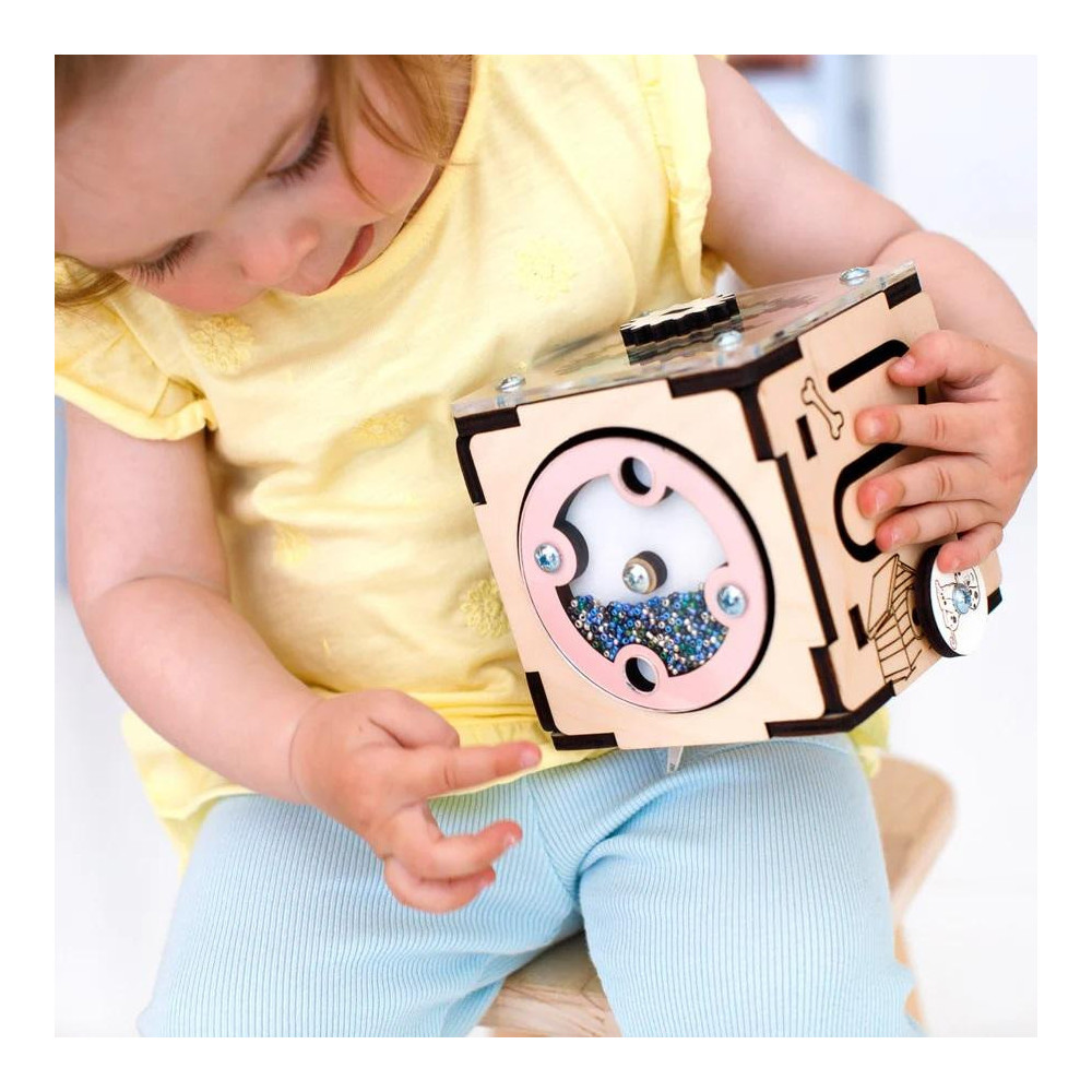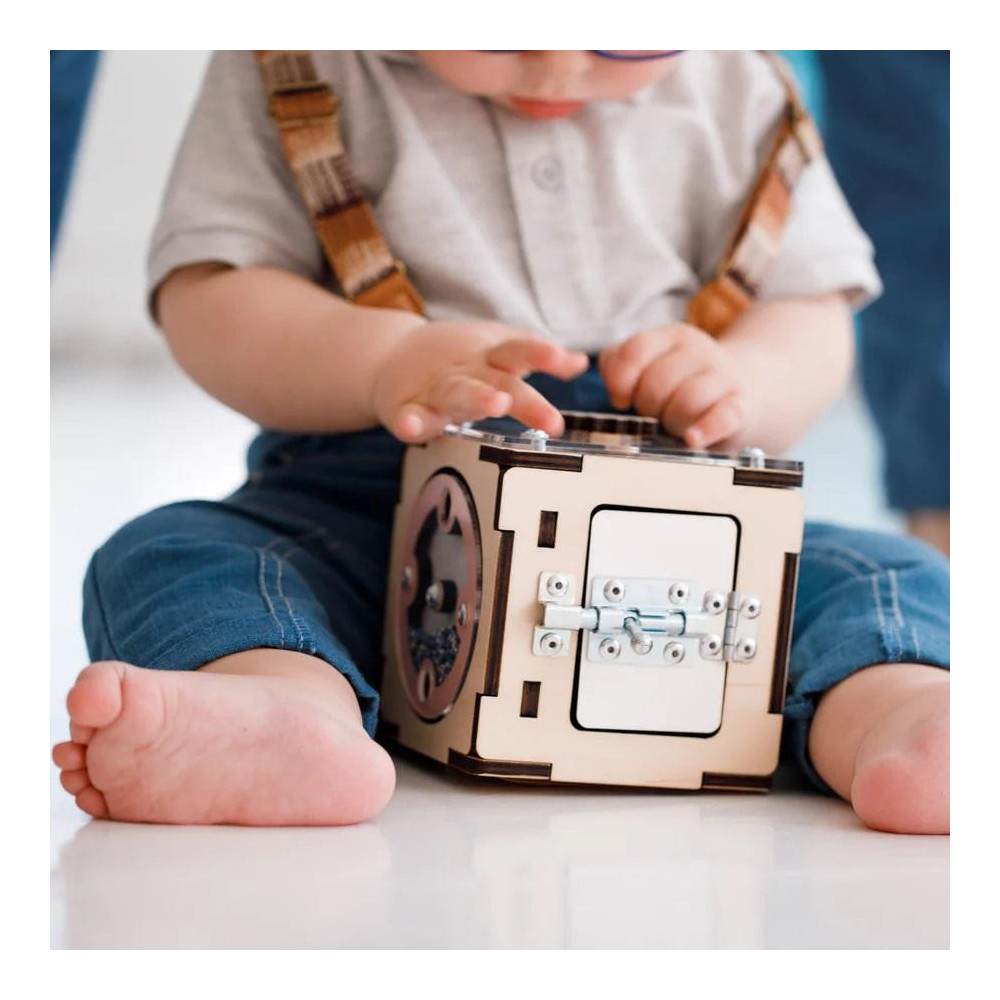 Interaktivní dřevěná kostka od BusyKids je ideální hračkou pro zvědavé děti od 1 roku. Na každé ze šesti stran nabízí různé aktivity: otáčecí elementy, zipy, suché zipy a spoustu dalších aktivit, které rozvíjejí smyslové a motorické dovednosti.