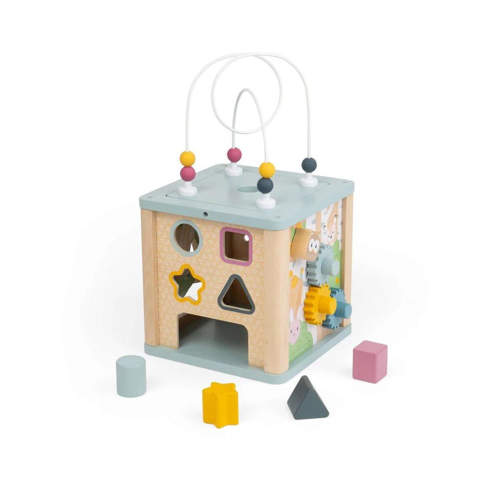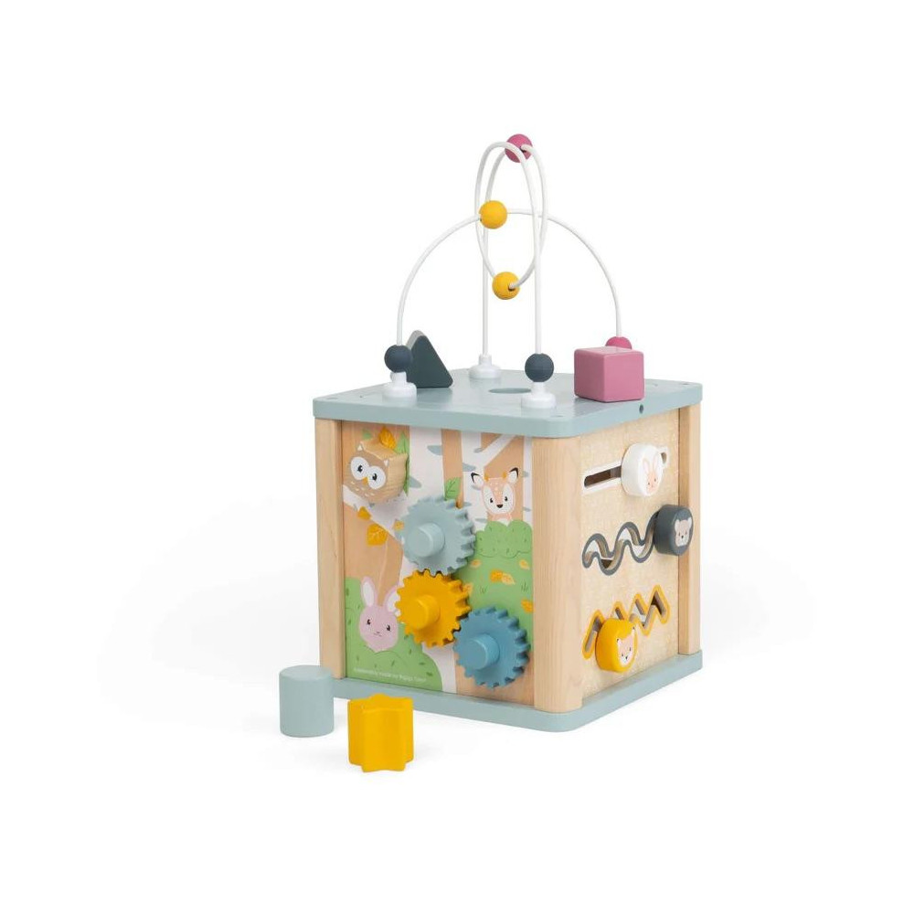 Děti se s touto motorickou kostkou zabaví na celé hodiny! Každá ze čtyř stran je plná hry, nadšení, zábavy. Tato rozmanitá motorická kostka je vyrobena ze stabilního 100% FSC® dřeva, najdete na ní například: vkládačku, kuličkovou dráhu, ozubená kolečka a další! Kombinace přírodního dřeva a jemných pastelových barev dělá tuto hračku perfektní pro chlapce i děvčata. Dřevěná motorická kostka dětem pomůže s rozvojem sociálních dovedností, komunikace, rozpoznávání čísel. Hračka byla vyrobena eticky z FSC certifikovaných materiálů. Jejich kvalita zaručuje dlouhou životnost kostky.