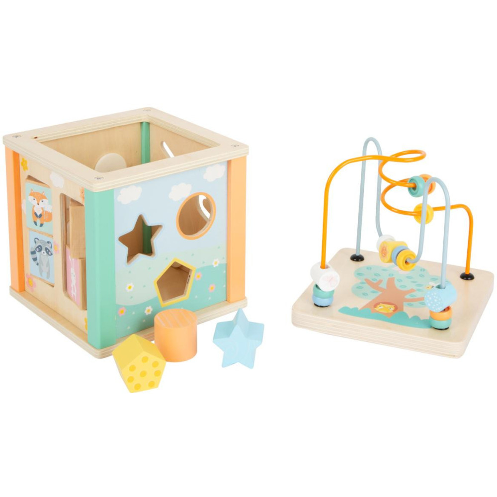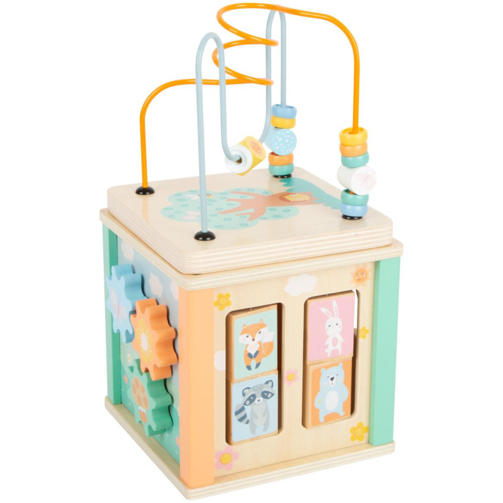 Skládejte, strkejte, klapejte, otáčejte! Můžete si hrát ze všech pěti stran! Dřevěná motoriká kostka nabídne zábavu i nejmenším dětem. Perličkové bludiště, otáčející se obrázky, otvory s kostkami pro vkládání, ozubená kolečka – všechny tyto prvky děti naučí rozevnávat barvy a tvary a také procvičí jejich jemnou motoriku. Trendy pastelové barvy, roztomilé zvířecí motivy, hravé detaily, tato kostka bude pravým poutačem v každém dětském pokojíku. Vrchní víko můžete sundat a uložit do kostky vzhůru nohama, ušetří vám tak kousek místa. Krásná motorická kostka je součástí produktové řady „Pastel“ a zaujme vysokým viditelným podílem dřeva a moderním zabarvením v pastelových barvách.