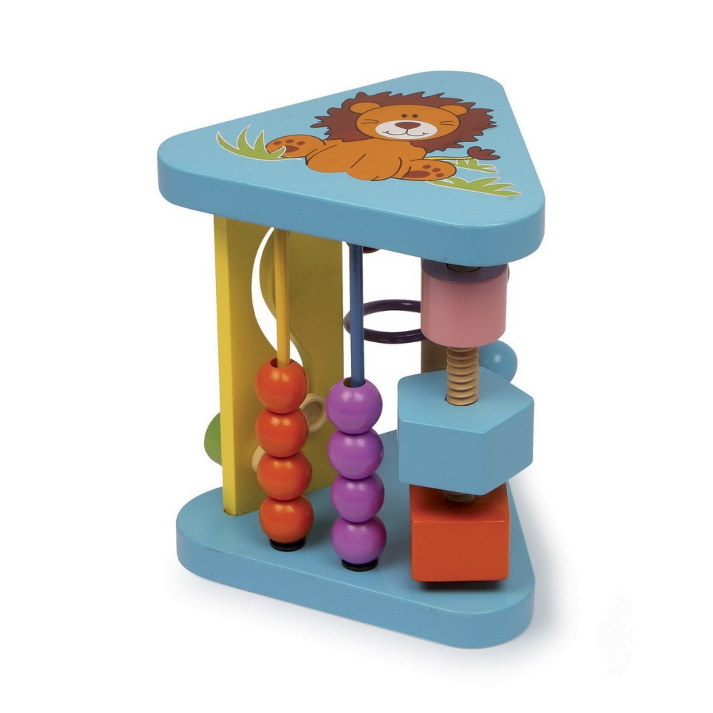 Stabilní třístranná motorická výzva z barevně lakovaného a přírodního dřeva. Děti mohou točit barevné dřevěné formy na závitové tyči, posouvat kuličky po smyčce nebo tyčkou sledovat danou cestičku.