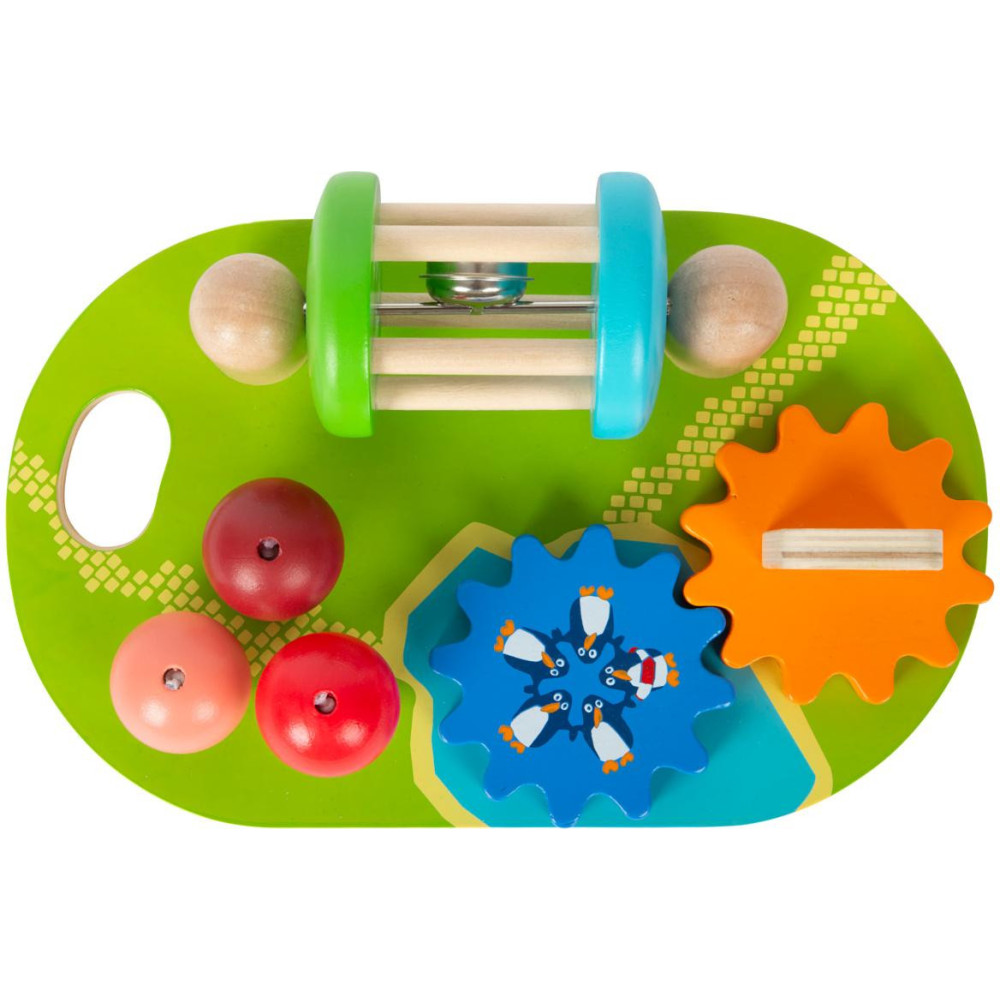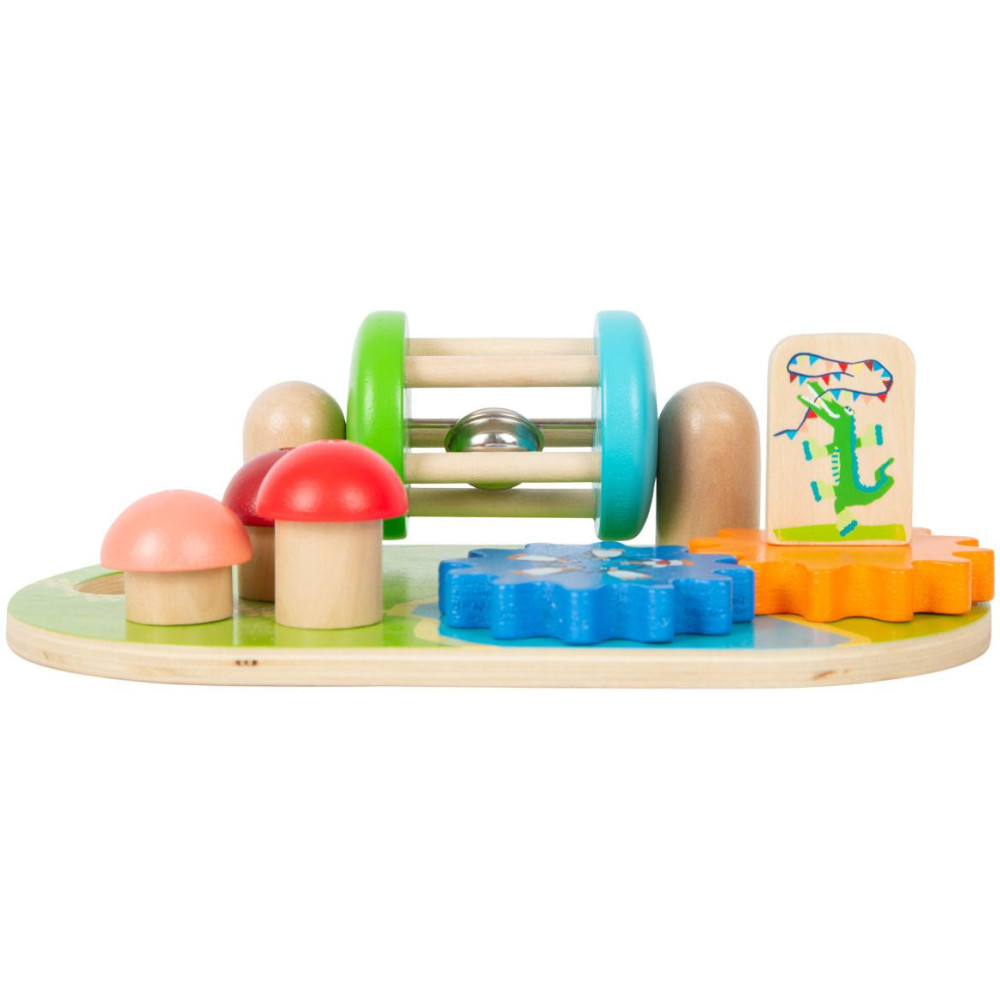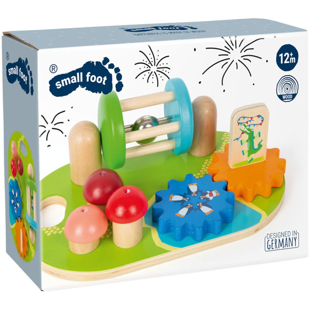Prozkoumejte zábavní park plný atrakcí, tvarů, barev a zvuků, které podněcují zvědavost nejmenších. Otáčejte ozubenými kolečky, tahejte za kloboučky roztomilé houbičky, nebo rozehrajte rolničku. Rozmanitými herními prvky mohou děti rozvíjet orientaci v prostoru, úchopové dovednosti i koordinaci rukou a zraku. Hračka je velmi robustní, kombinuje prvky z odolné překližky a masivního dřeva.