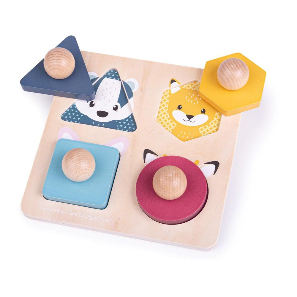 Tato dřevěná skládačka pomáhá malým dětem rozvíjet smysl pro tvary, barvy a rozpoznávat zvířata, protože tvar přiřazují ke správným otvorům na základní desce. Jakmile jsou všechny dílky skládaček vloženy, vytvoří se živý obrázek se zvířátky. Skládačka je vhodná pro malé ručičky, protože mohou pomocí velkých dřevěných úchytů zvednout tvary a odhalit zvířátko pod nimi. Skvělý způsob, jak rozvíjet jemné motorické dovednosti a zručnost malých dětí při zvednutí, uchopení a zkoumání každého dílku skládačky. Vyrobeno z prvotřídního, udržitelného FSC dřeva, barveno netoxickými barvami a laky.