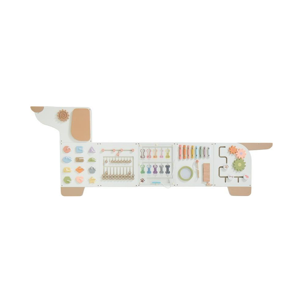 Tato velká dřevěná motorická deska ve tvaru pejska v jemných pastelových barvách přináší dětem nekonečné možnosti objevování a hraní. Její originální tvar a hravý design zaujme na první pohled, a ještě víc potěší pestrou nabídkou aktivit, které dětem nabízí. Po celé délce „tělíčka“ pejska děti najdou více než deset různorodých herních prvků – otočná a ozubená kolečka, xylofon, barevné otevírací geometrické tvary, bludiště, počítadlo, zrcátko, hmatové a motorické dráhy, třídění barevných kuliček podle počtu pomocí magnetického pera a další hravé detaily.