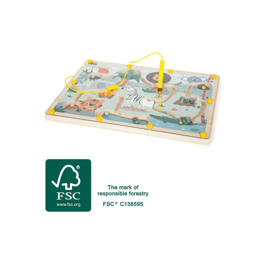 Toto magnetické bludiště vyrobené ze 100% FSC® certifikovaného dřeva nabízí dlouhotrvající zábavu s krásnými ilustracemi ze zvířecí říše a chytrým herním principem: barevné kuličky se pomocí magnetického pera vedou spletitými cestičkami a přiřazují se ke správným barevným políčkům a číslům. Na děti čekají různé výzvy jako otáčecí plošiny a slepé uličky. Cílem hry je dostat kuličky na správná místa podle barvy a počtu. Čísla v cílových políčkách odpovídají počtu kuliček dané barvy. Díky upevňovacímu pásku, který drží magnetické pero na místě, je hračka ideální i na cesty.