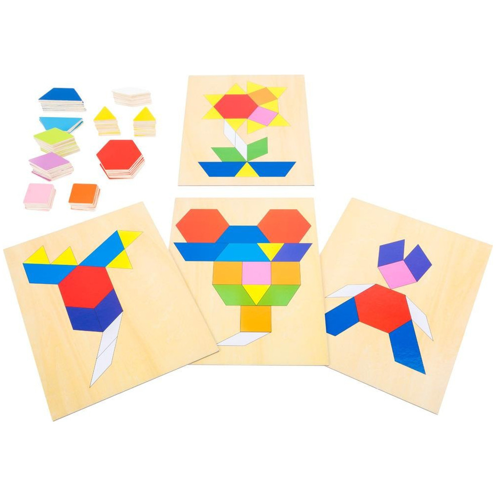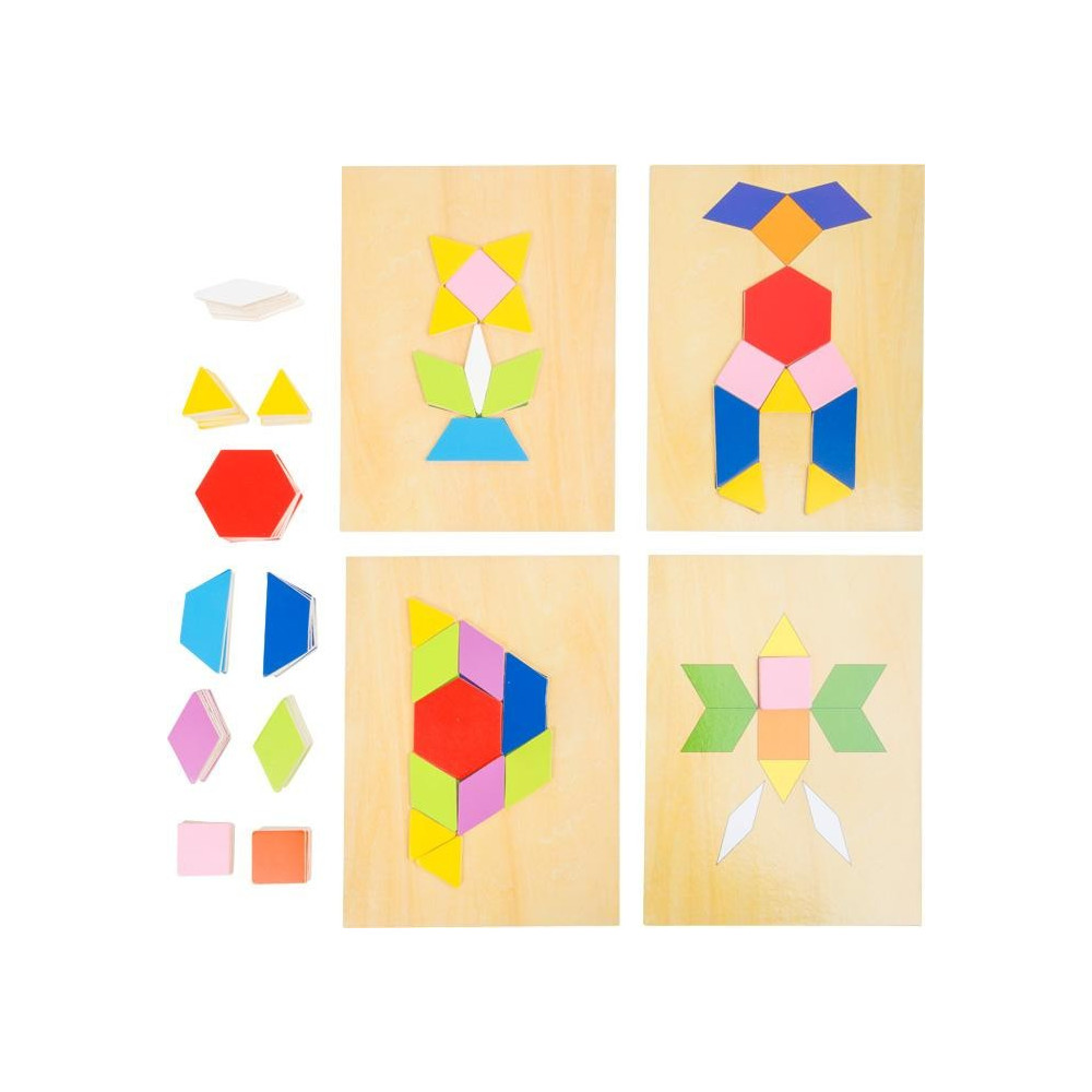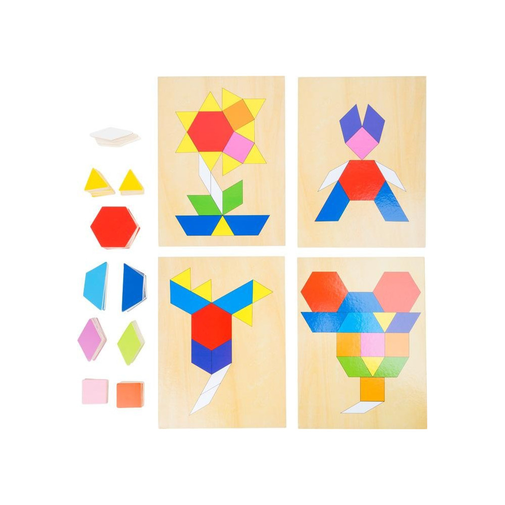 Na 4 kartách jsou zobrazeny motivy, které mají být zkopírovány pomocí mozaiky. Dřevěná hračka mozaika je uschována v krabičce s posuvným víkem.