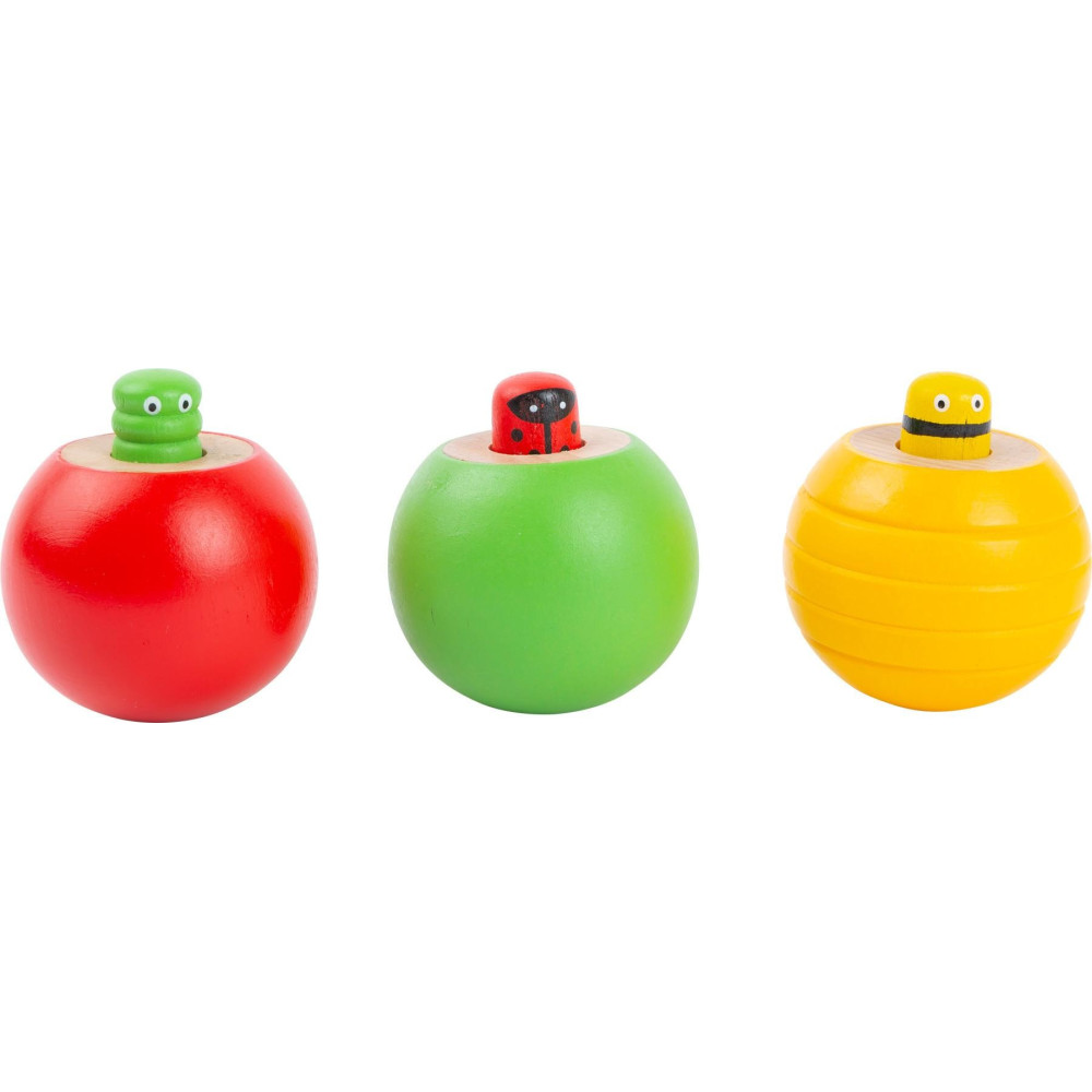 Mohly by tyto hračky ve tvaru ovoce s vykukujícím hmyzem fungovat jako káča? Barevné míčky z pevného dřeva, z kterých vykukuje včelka, housenka a beruška vydávají při zatlačení vtipný zvuk. Když je zamáčknete a poté opět vypustíte, hračka vyskočí, což jistě děti rozveselí. Tři typy s rozdílnými barvami a detaily.