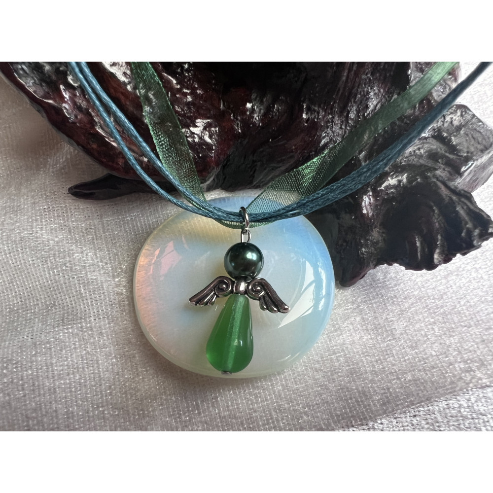 Zelený náhrdelník s andílkem. Víceřadá šňůrka s karabinkou z nerezové oceli.