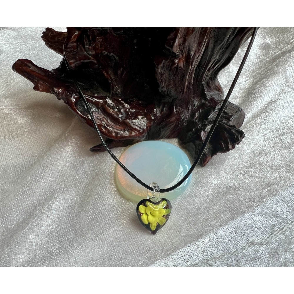 Alada beauty Náhrdelník skleněné srdce se žlutým květem na černé splétané šňůrce s karabinkou.