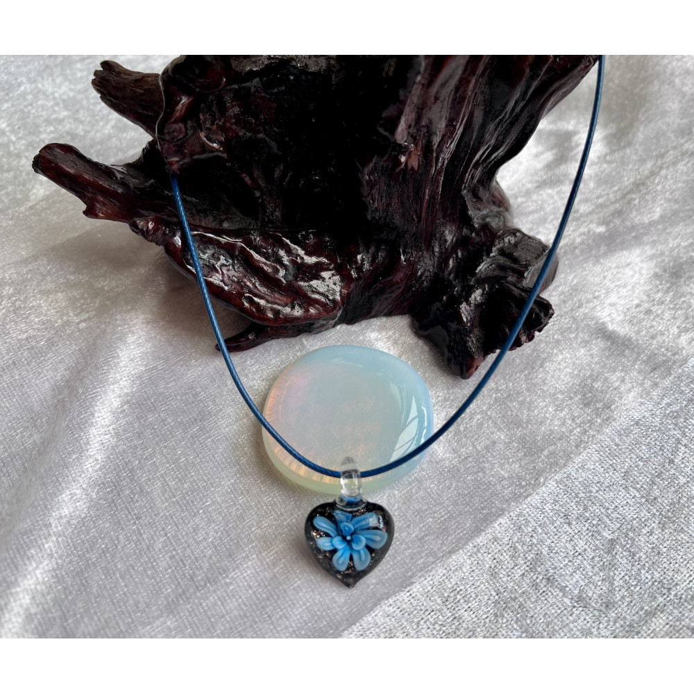 Alada beauty Náhrdelník skleněné srdce se světle modrým květem na modré splétané šňůrce s karabinkou.