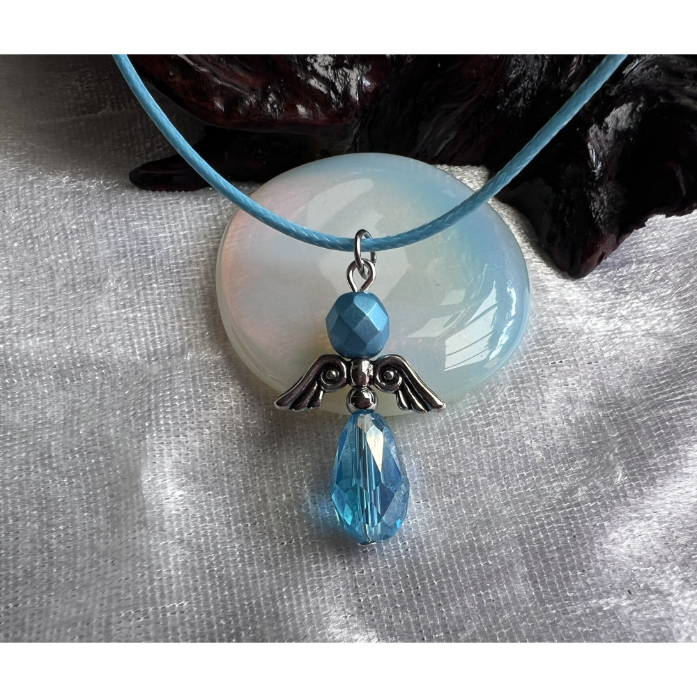 Alada beauty Náhrdelník světle modrý andílek na světle modré splétané šňůrce s karabinkou.