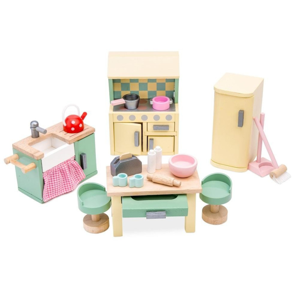 Žádný domeček pro panenky není kompletní bez vybavené kuchyně. S tímto krásným dřevěným setem do kuchyně mohou děti uvařit nebo upéct něco dobrého pro své miniaturní hosty. Tento představivý set s důrazem na detail se skládá z dřezu, sporáku, trouby s otevíratelnými dveřmi, velké lednice s otevíratelnými dveřmi, stolu s 2 židličkami, na kterém můžete krájet a připravovat. Velikostně se hodí do domečků pro panenky od Le Toy Van, více doplňků domečků z řady Daisylane najdete na našem webu. Hračky s účelemVšechny hračky firmy Le Toy Van jsou vyrobeny s cílem – aby dlouho vydržely. Designovány s láskou zkušenými řemeslníky za použití etických praktik a udržitelných materiálů, které jsou laskavější k naší planetě. Hlavní vlastnosti: měřítko 1:12vyrobeno eticky z udržitelných materiálůtestováno dle nejpřísnějších standardůmalováno netoxickými barvami na bázi vodytrénuje komunikační dovednosti a koordinaciinspiruje ke kreativní a představivé hře Daisylane kolekce: Prestižní kolekce domečků pro panenky a doplňků firmy Le Toy Van. Před více než 25 lety zakladatel Georges navrhl svůj úplně první domeček pro panenky, stavební kámen této firmy. Vyrobeno eticky z udržitelných materiálů, dřevěné domečky pro panenky Daisylane jsou jedinečné a nebudou dětskou představivost držet zpátky. Rodinné dědictví, opravdová investice do hraní. Značka a certifikát FSC® (Forest Stewardship Council) zaručuje, že dřevo, ze kterého byl produkt vyroben, nebylo vytěženo nelegálně a pochází z lesů obhospodařovaných šetrným či přírodě blízkým způsobem, ve kterém jsou dodržovány přísné environmentální a sociální požadavky. Značka FSC® na výrobku znamená, že svým nákupem pomáháte chránit lesy a podporujete šetrné, odpovědné či přírodě blízké hospodaření, díky kterému jsou naše lesy stabilnější, zdravější, mají přirozenou druhovou skladbu a lépe odolávají negativním následkům klimatických změn.