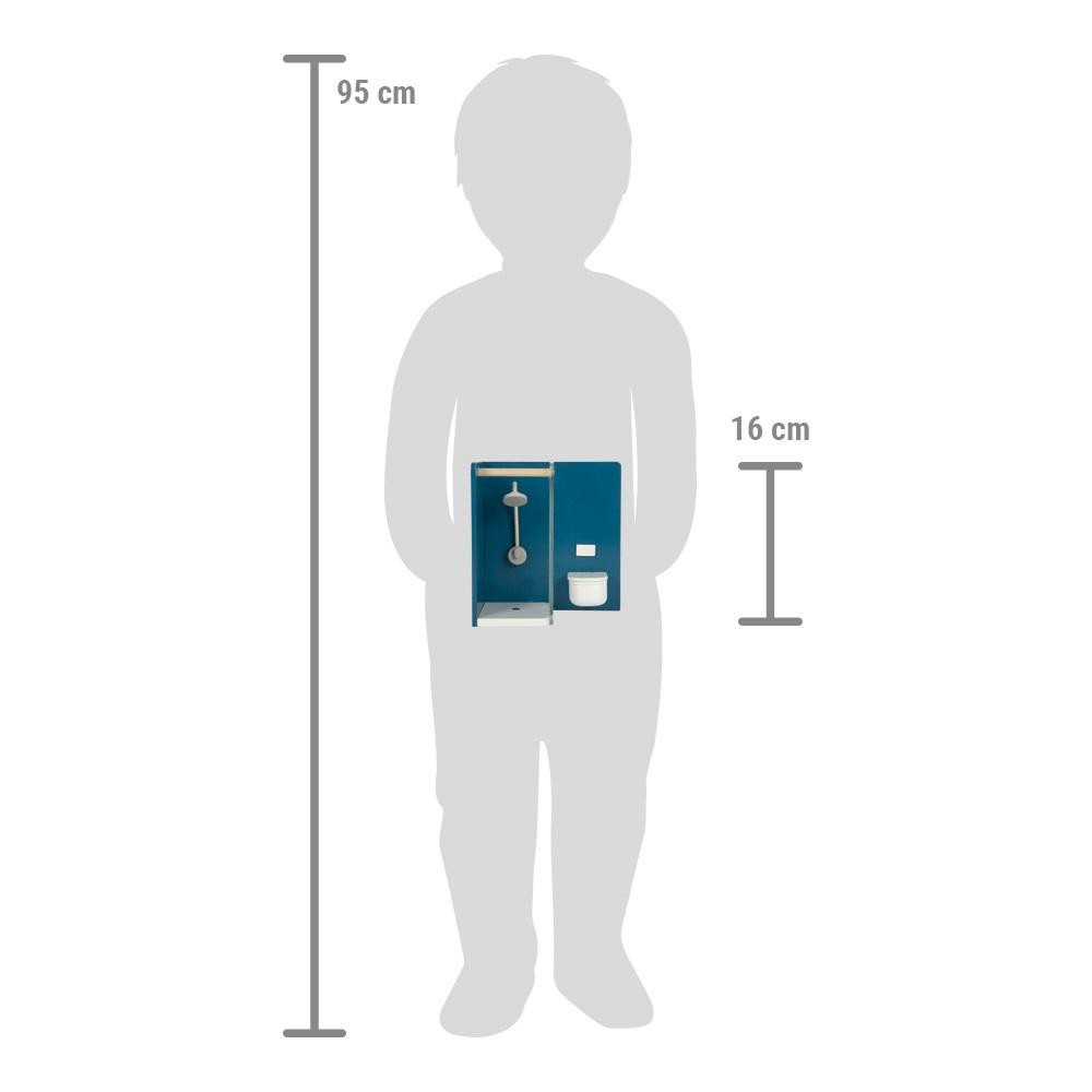 Toto koupelnové vybavení je nejen krásným doplňkem pro každý domeček pro panenky, ale také motivuje děti ke kreativní hře a rozvíjí jejich představivost. Je vyrobeno tak, aby co nejvíce odpovídalo skutečné koupelně. Součástí je sprchový kout s akrylátovou zástěnou (výška sprchy je nastavitelná), kobereček, závěsné WC a moderní umyvadlo s malým ručníkem.
