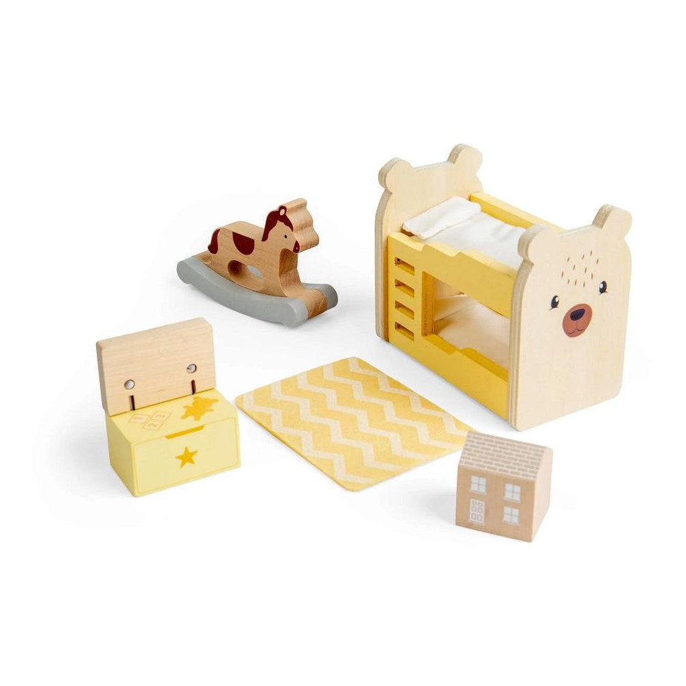 Dopřejte panenkám vlastní hravý prostor s touto roztomilou sadou do dětského pokojíčku. Barevný a veselý nábytek promění každý domeček pro panenky v místo plné zábavy, odpočinku i dobrodružství. Sada je navržena tak, aby podporovala nápaditou hru a vytváření příběhů z každodenního života. Děti mohou panenky ukládat do patrové postýlky, hrát si s hračkami nebo zařizovat pokoj podle vlastní fantazie. Při manipulaci s jednotlivými dílky si zároveň rozvíjejí jemnou motoriku, koordinaci rukou a očí i sociální dovednosti. Nábytek je vyroben z kvalitního, odpovědně získaného dřeva s certifikací FSC®, takže je bezpečný, odolný a šetrný k přírodě. Skvěle doplní většinu standardních domečků pro panenky a rozšíří jejich vybavení o útulný dětský pokoj.