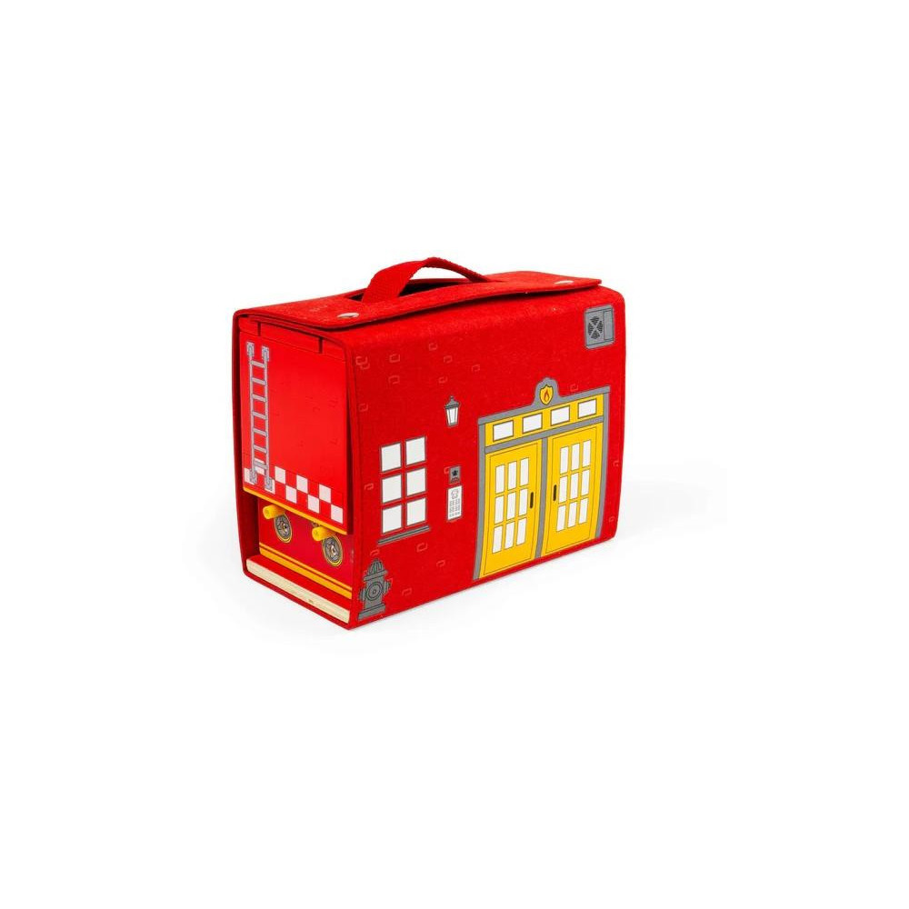 Vydejte se na záchrannou misi kdykoli a kdekoli! Tato kompaktní hasičská stanice je součástí kolekce přenosných herních sad a díky skládacím plstěným bokům se snadno sbalí i přenáší. Sada nabízí vše, co malý hasič potřebuje pro dobrodružnou hru na cestách. Děti si mohou přehrávat napínavé záchranné akce s hasičským autem, dvěma figurkami hasičů a dalšími doplňky. Dřevěná stanice zároveň slouží jako praktické úložný box i herní prostor. Nechybí ani žebřík, hadice, bezpečnostní kužel a požární hydrant, které rozšiřují možnosti kreativního vyprávění. Hra podporuje rozvoj fantazie, komunikačních dovedností i sociální interakce při společném hraní. Díky kompaktnímu provedení, snadnému úklidu a pevné rukojeti je sada ideální na cesty, dovolenou i návštěvy. Vyrobeno z kvalitního FSC® certifikovaného dřeva z udržitelných zdrojů. Sada je odolná, bezpečná a dodává se ve 100% recyklovatelném balení bez plastů – skvělá volba pro ekologicky smýšlející rodiny.