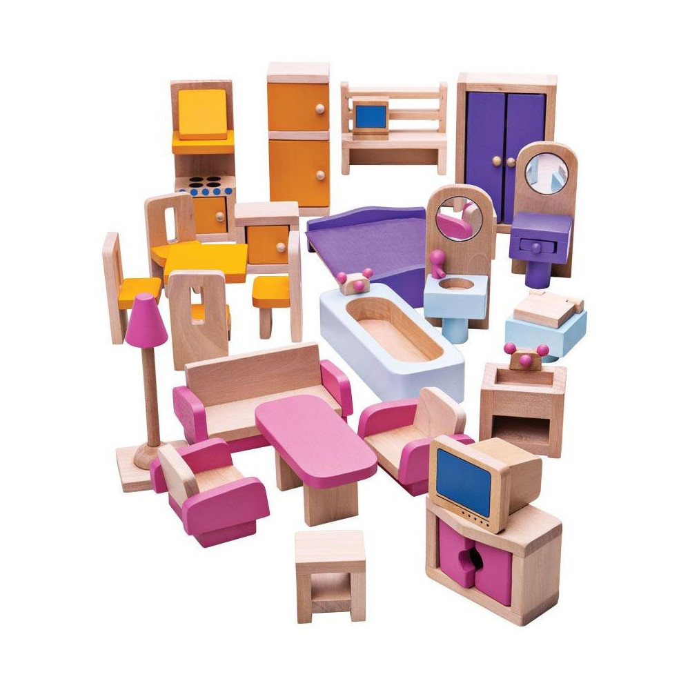Tady je skvělá sada dřevěného nábytku, díky které si můžete vybavit jakýkoli domeček. Nábytek plně vybaví kuchyň, obývací pokoj, ložnici, koupelnu a dokonce i podkroví. Tyto nádherně detailní dřevěné kousky pomohou mladým představám znovu a znovu vytvářet okouzlující interiérové scény. Skládá se z 26 kusů nábytku. Vyrobeno z vysoce kvalitních materiálů ze zodpovědných zdrojů. Odpovídá současným evropským bezpečnostním normám.