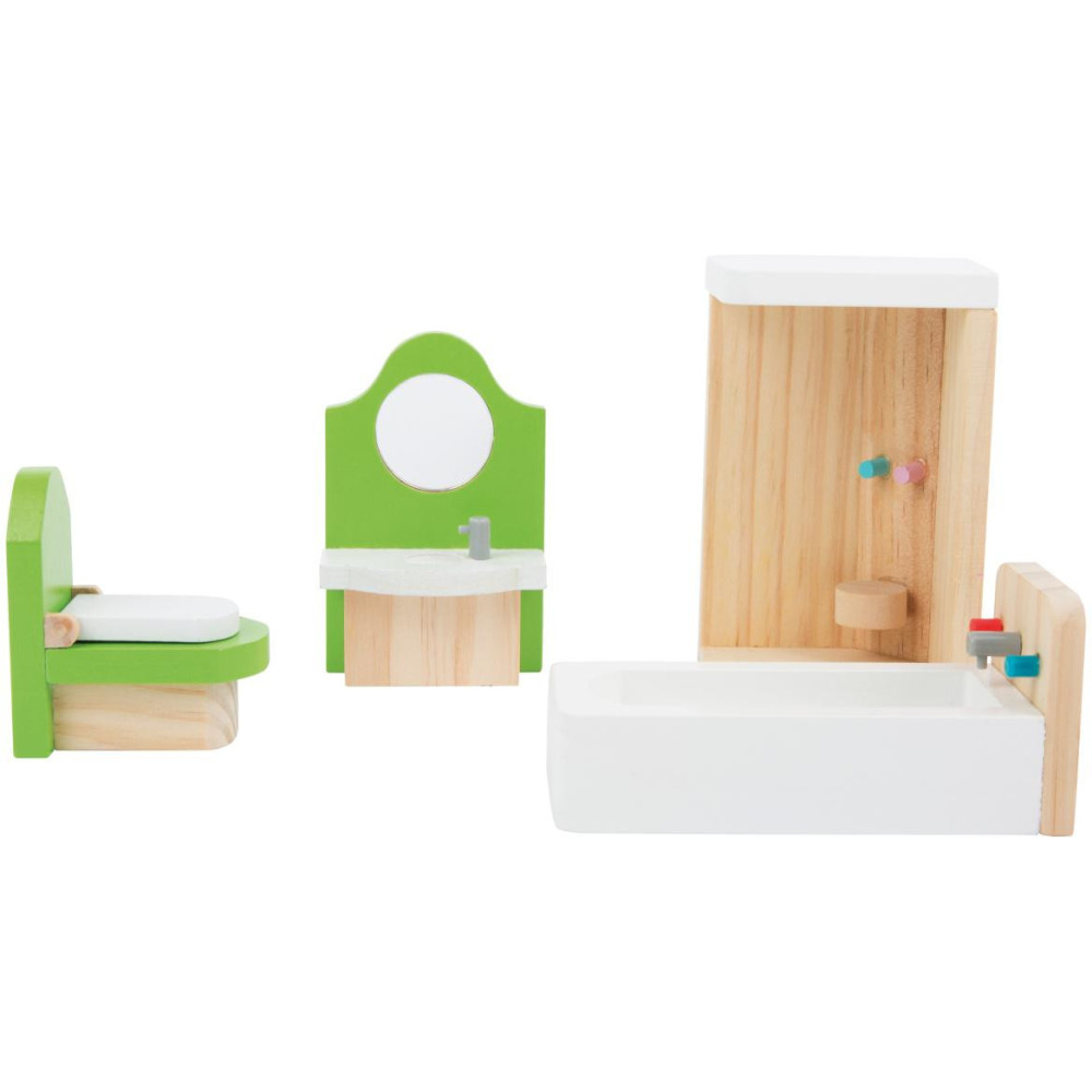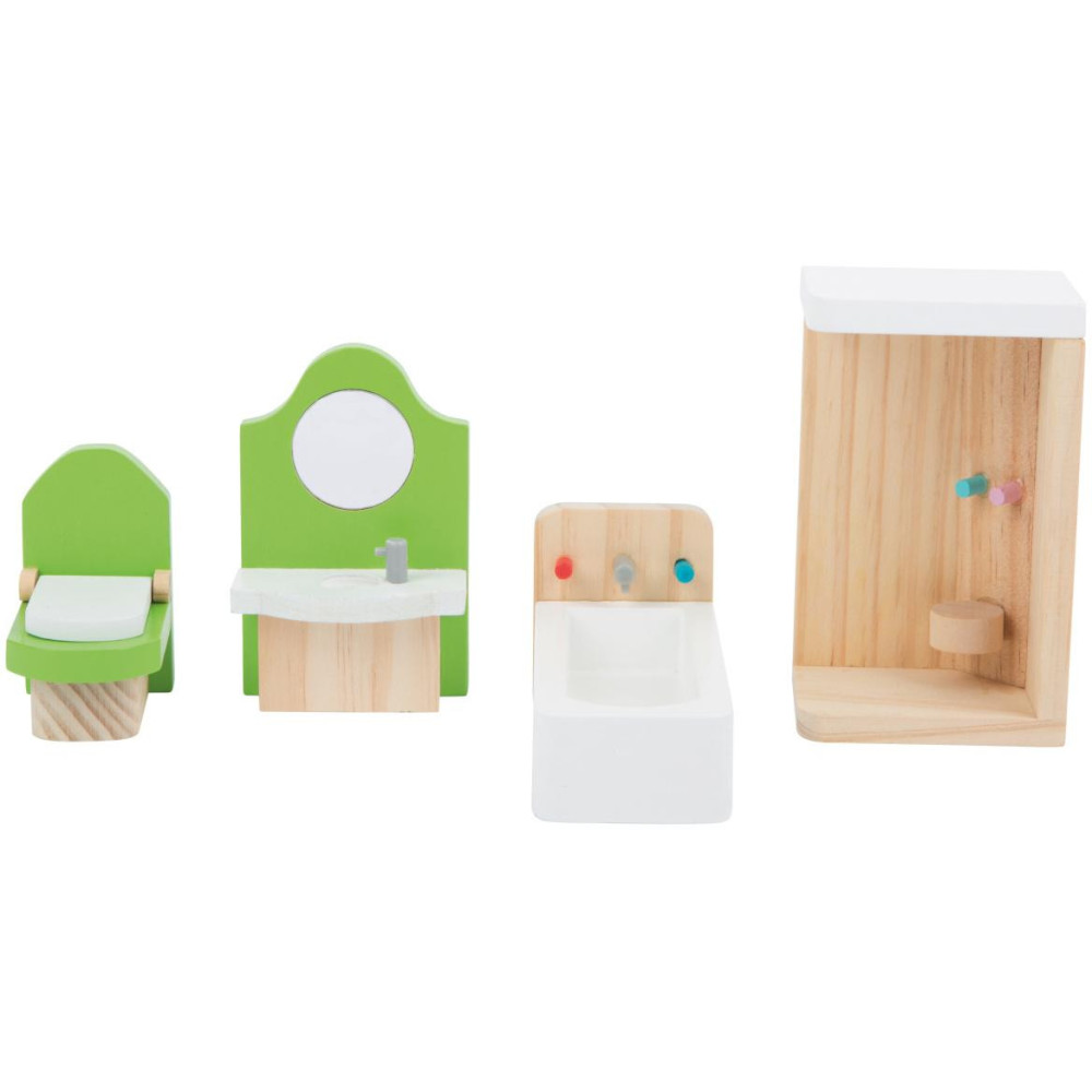 Tato 4 dílná sada vybavení do koupelny má velikost pro ohýbací panenky do 12 cm. Je vyrobena z masivního dřeva pro dlouhou životnost.