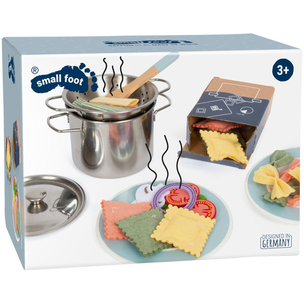 Vždy al dente! Staňte se mistry ve vaření těstovin s bohatou soupravou nádobí a rozmanitého příslušenství. V sadě naleznete atraktivní plstěné makety několika druhů těstovin a dalších přísad. Na krabičkách k ingrediencím je vyobrazen správný postup vaření, děti tak snadno znalostmi přípravy oslní návštěvu. Nádobí je realisticky vyrobené z kovu a skvěle doplní každou dětskou kuchyňku. Nezbytnou součástí je i servis, s jehož pomocí mohou děti rozvíjet sociální dovednosti.
