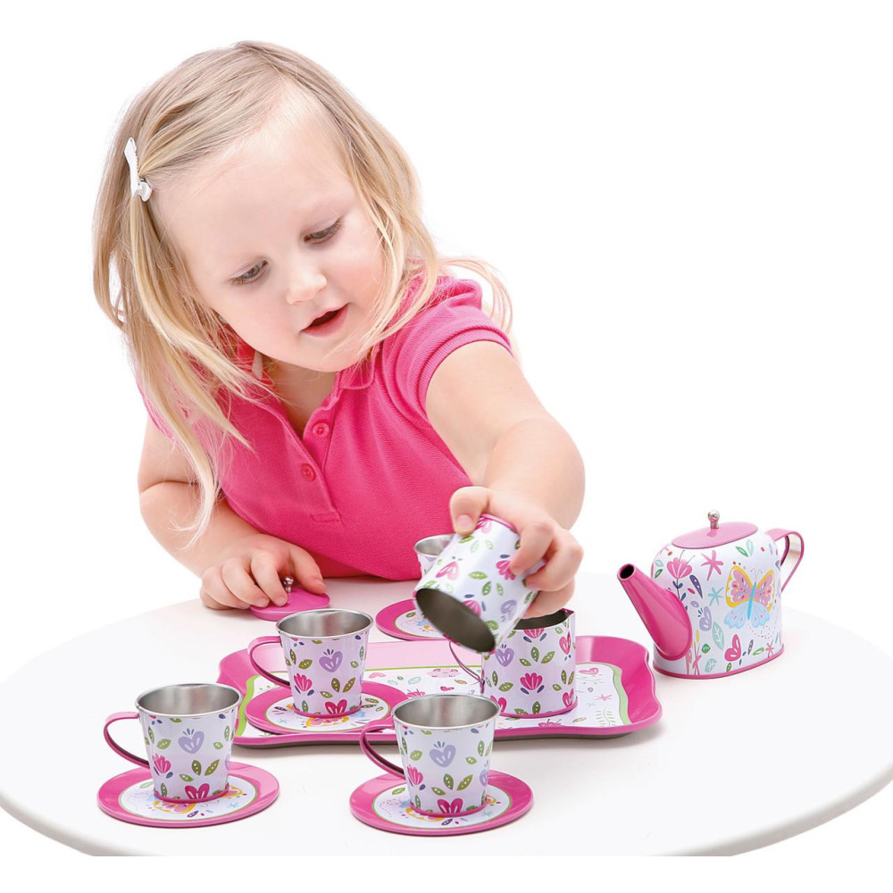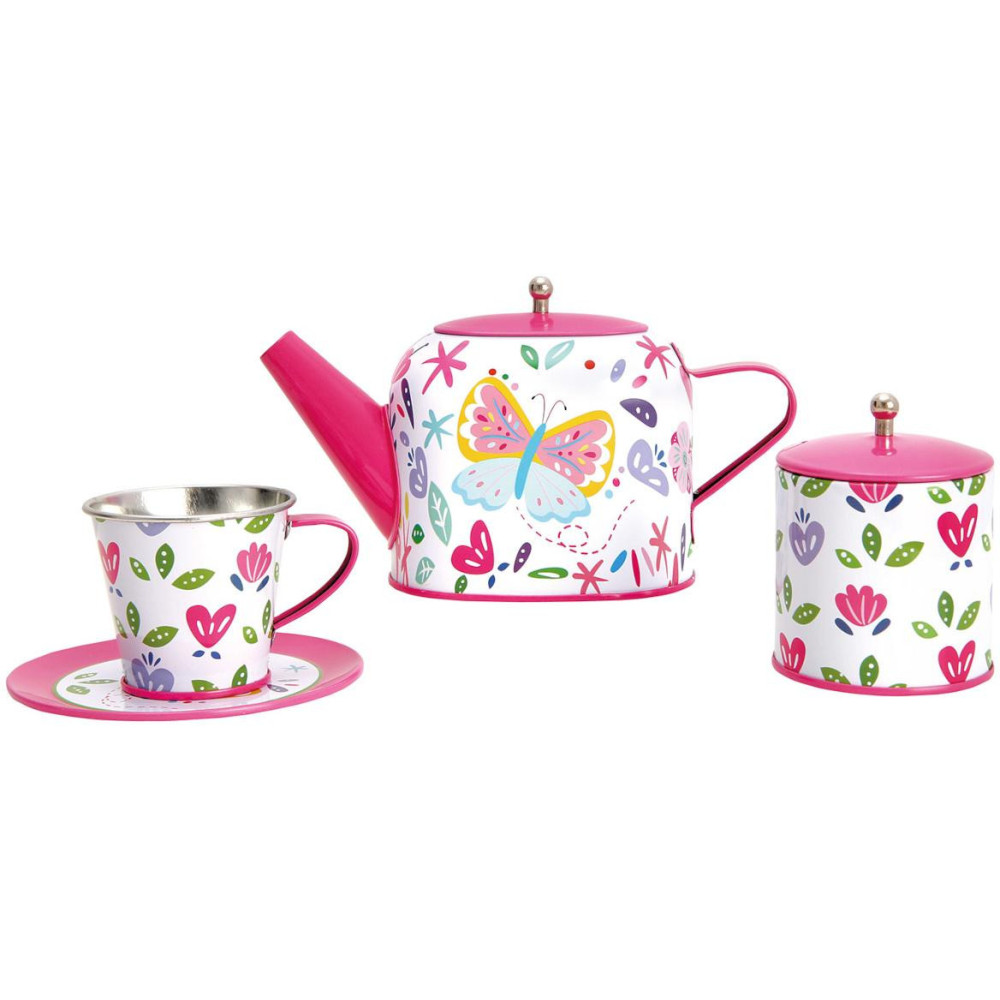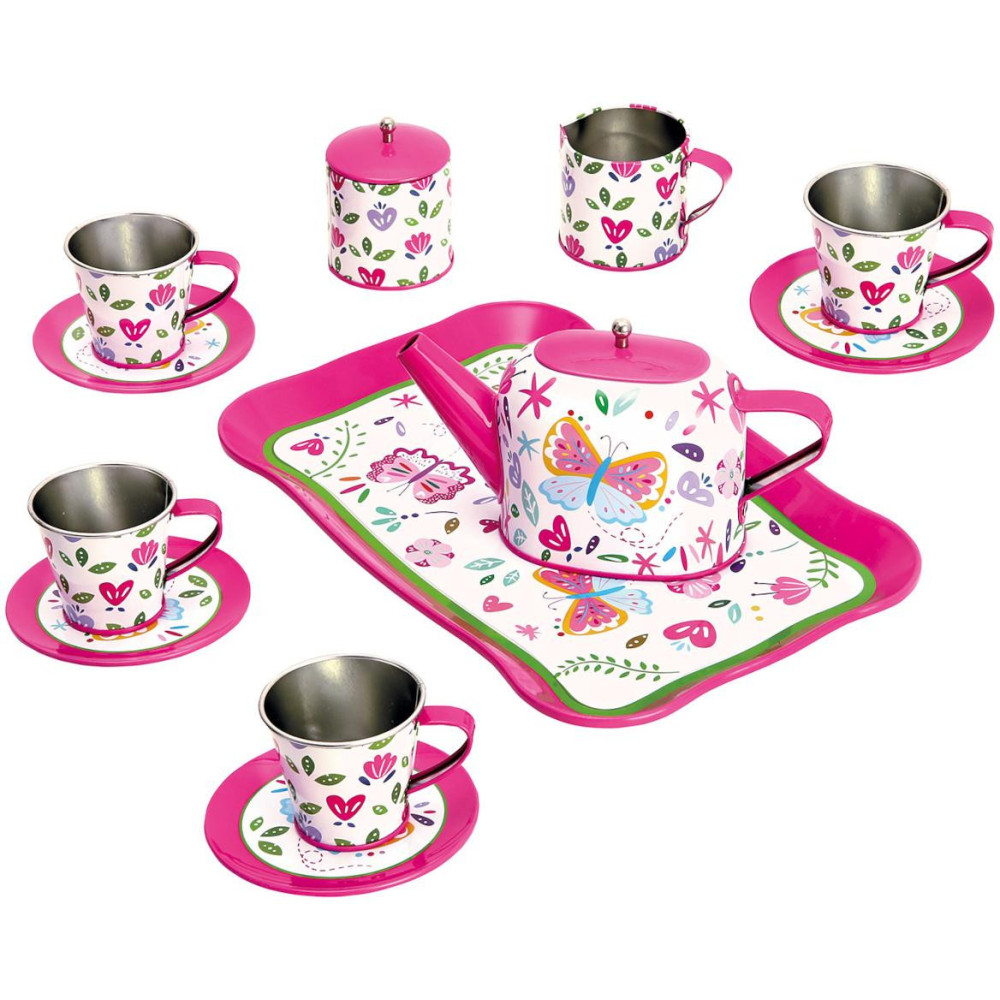Plyšoví přátelé a panenky jistě neodmítnou pozvání na čaj podávaný v tak kouzelném servisu! Jeho pomocí mohou děti rozehrát fantastické hry a učit se přitom způsobnému společenskému chování. Souprava je detailně dekorovaná, vyrobená z odolného lehkého kovu.