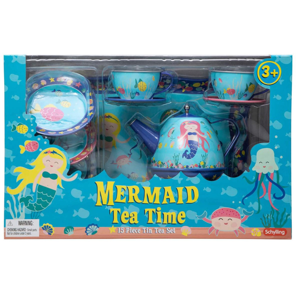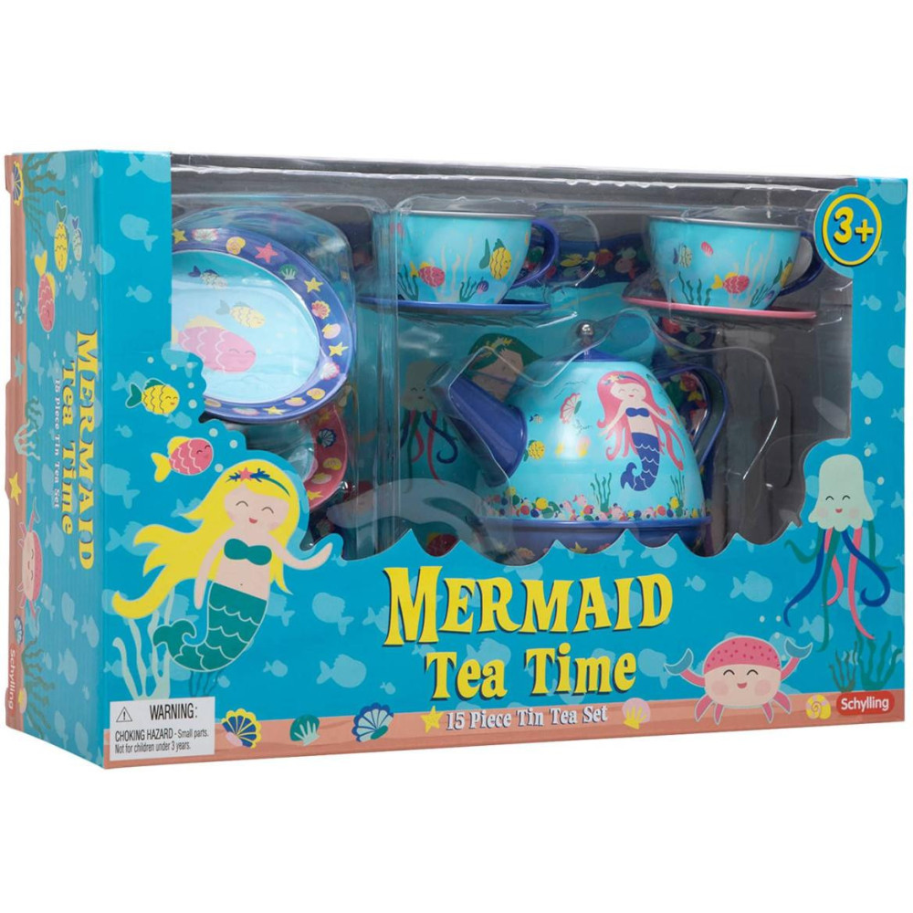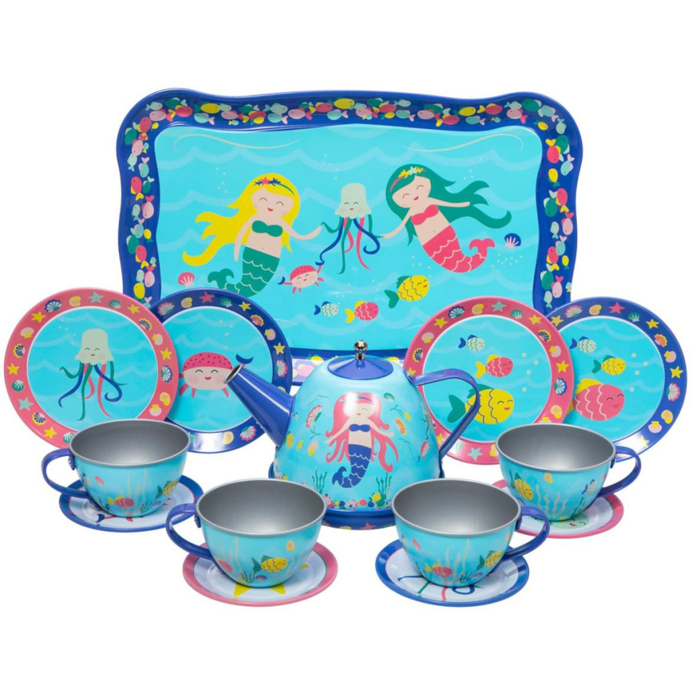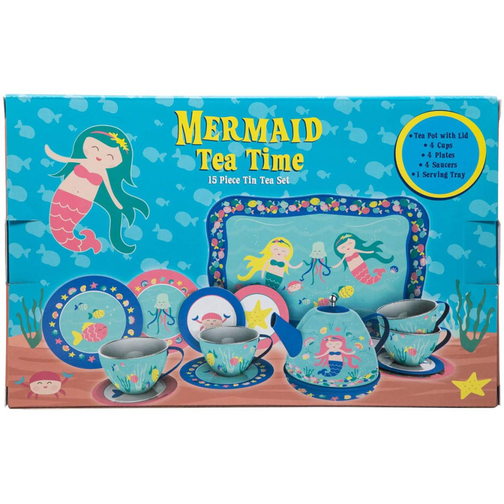 Je čas na čaj. Krásná 15 dílná čajová sada vyrobená z kovu, obsahuje 4 šálky s podšálky, 4 dezertními talířky, konvici na čaj s pokličkou a servírovací tác, vše v designu mořských pannen. Kreativita stoupá, když Vaše ratolesti hostí kamarády, panenky a plyšové hračky s touto krásnou čajovou. Vhodné pro malé hostitele a hostitelky ve věku od 3 let. Hlavní vlastnosti: 15dílná čajová sadaideální pro předstírané čajové dýchánkydesign s motivem mořských panen