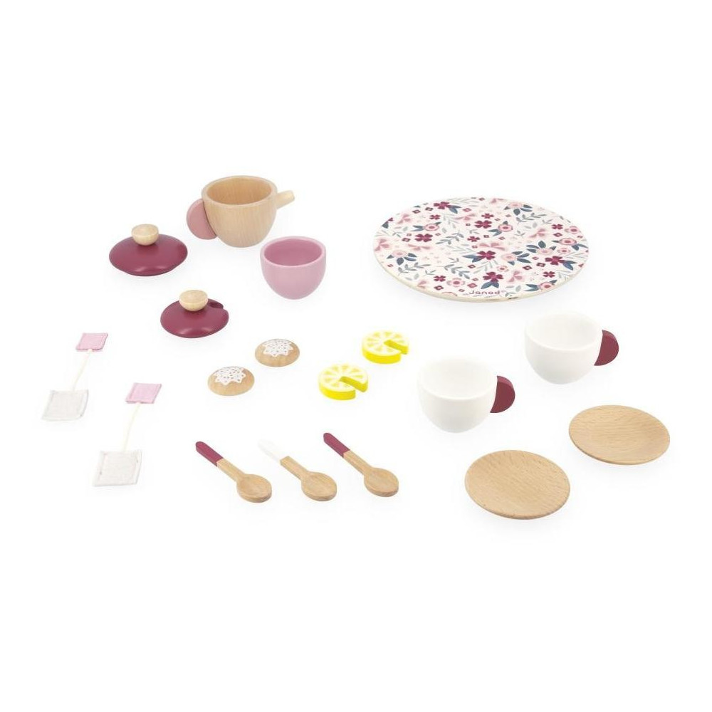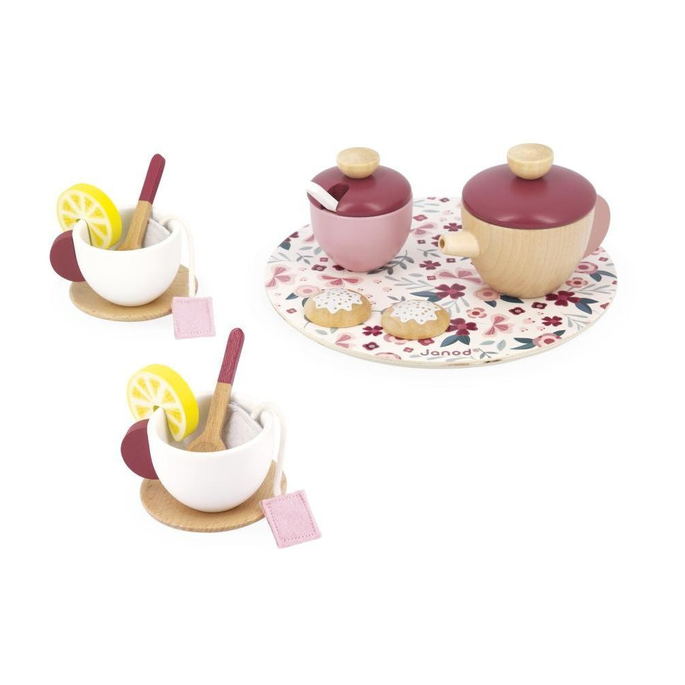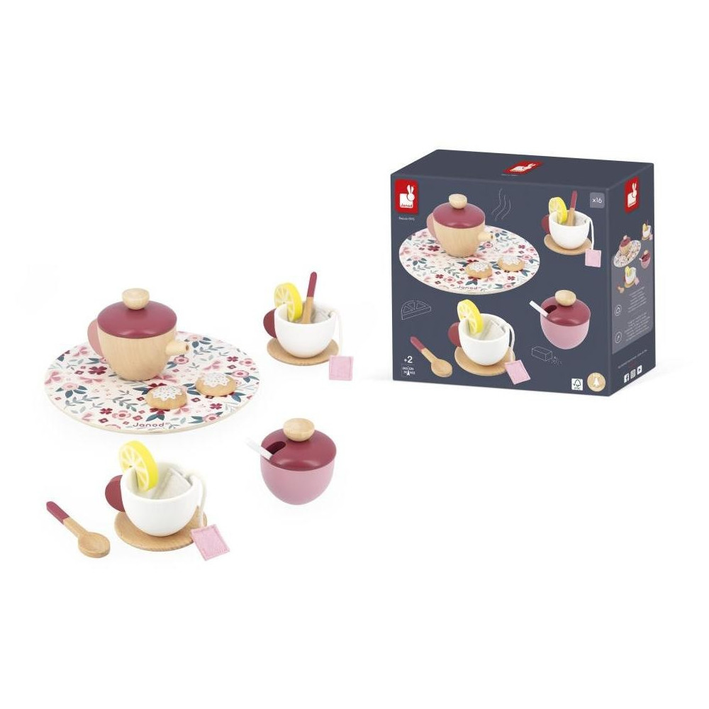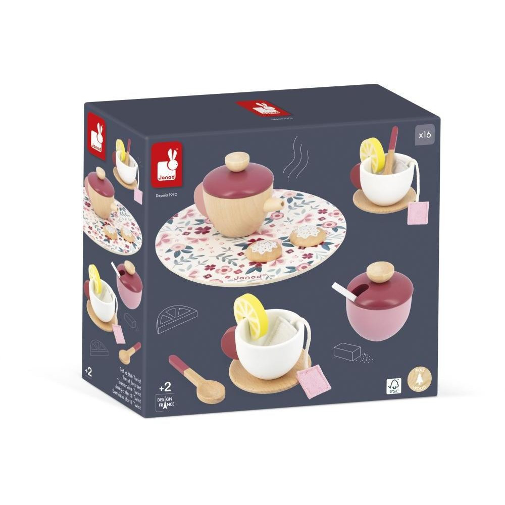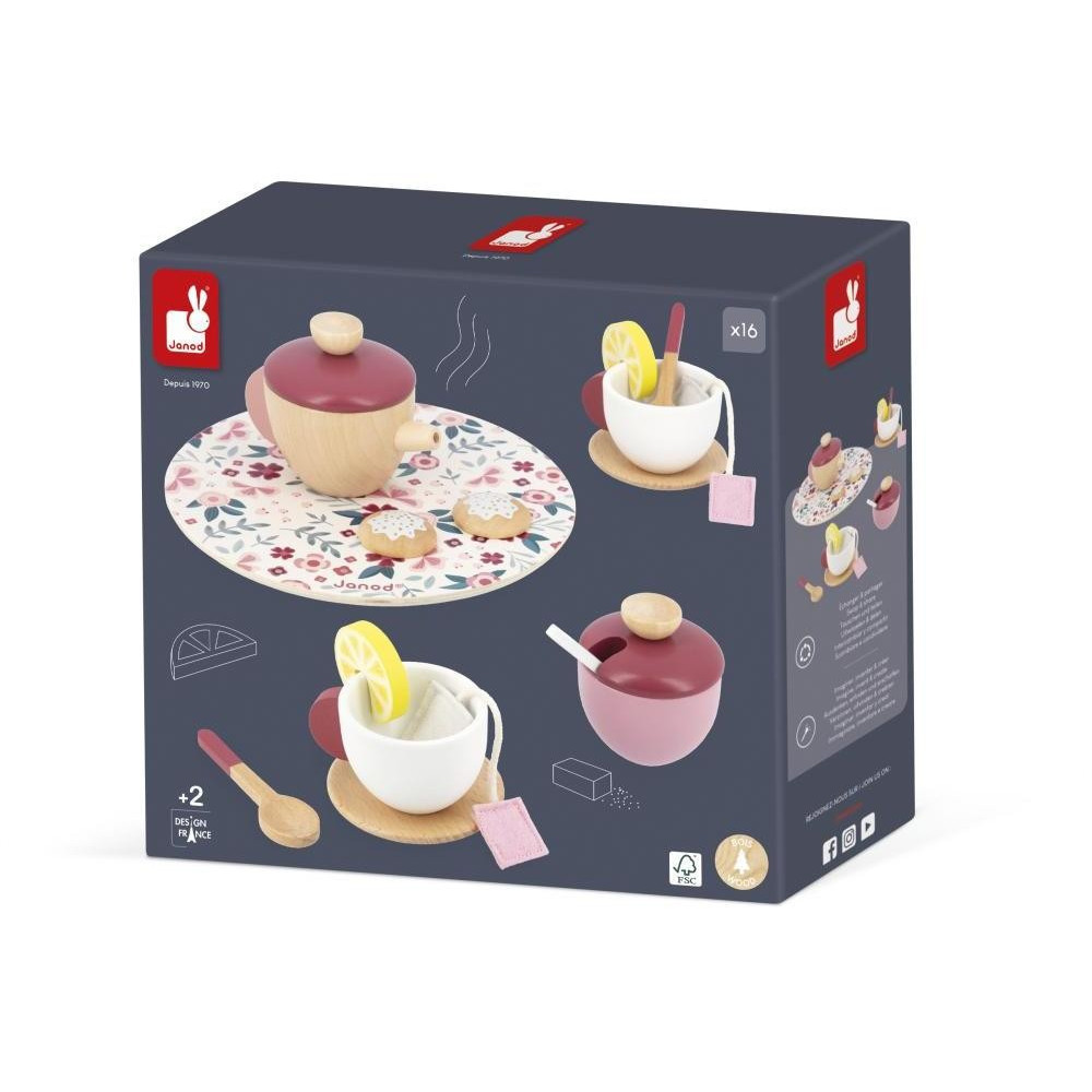 Pozvite svojich priateľov na čajový večierok s touto krásnou kvetinovou čajovou súpravou! Táto súprava sa skladá z čajníka, cukorničky, dvoch šálok, dvoch podšálok a troch lyžičiek vyrobených z dreva. Pretože je dôležité prispôsobiť sa individuálnym chutiam, vaše dieťa bude mať k dispozícii 2 plstené vrecúška na čaj, 2 plátky citróna a 2 sušienky, aby uspokojilo svojich hostí. Táto súprava sa dodáva na peknom drevenom podnose s kvetinovým vzorom. S touto čajovou súpravou môže vaše dieťa rozvíjať svoju predstavivosť alebo sa pokúsiť napodobniť služby tých najlepších londýnskych čajovní. Drevená hračka FSCTM. Imitácia hračky pre deti od 2 rokov.
