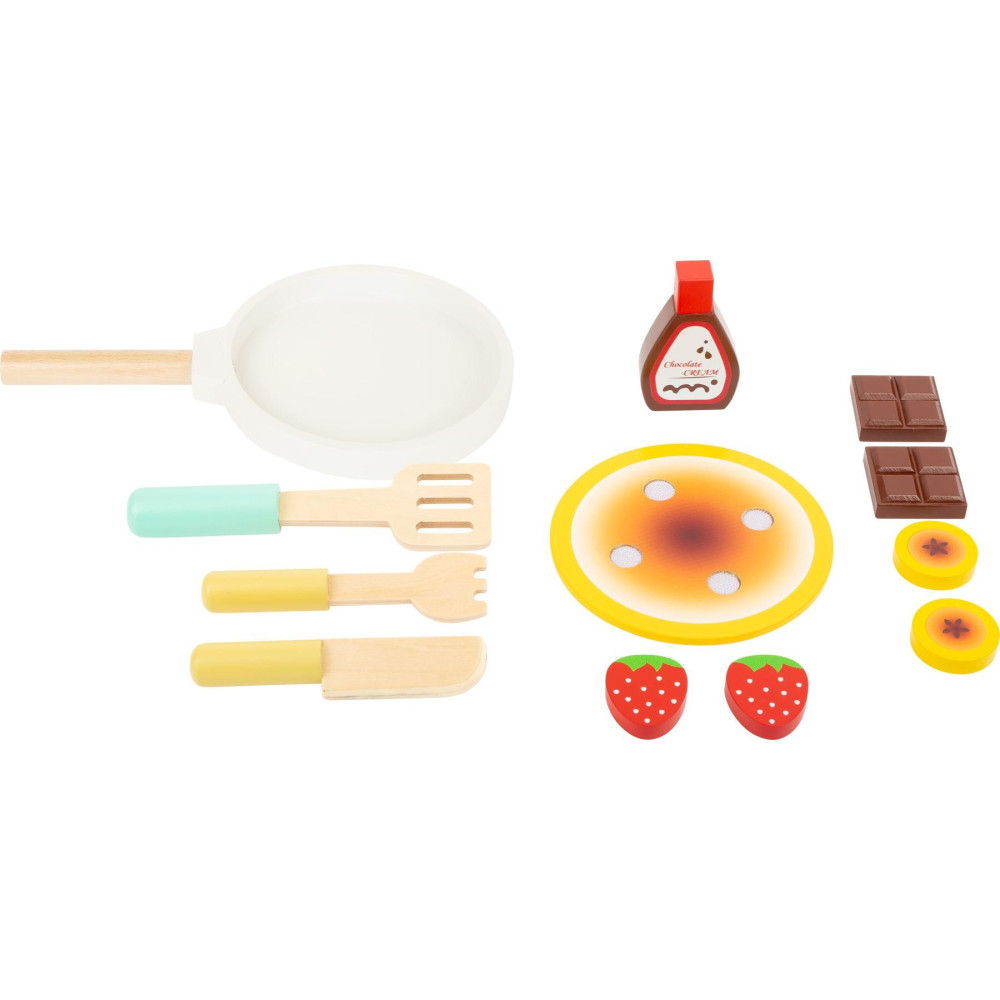 Dnes připravíme palačinku! Díky této herní sadě ze dřeva připravují malí kuchaři chutné pokrmy a palačinky ve své kuchyňce. Robustní pánev na palačinky, které lze ozdobit přísadami na suchý zip. Obracečka, poleva a příbory doplňují sadu palačinek.