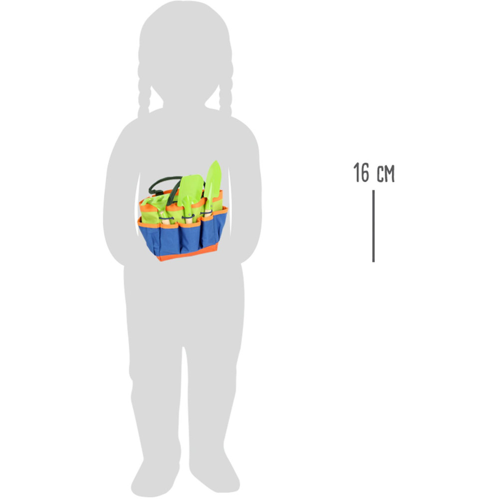 Přenosný set malých zahradníků. Tento velmi kvalitní zahradnický set obsahuje lopatku, motyku a rýč. Taška se dá jednoduše vyprat, nářadí omýt vodou. Nářadí je vyrobeno z masivního dřeva a kovu, velikostně tak akorát pro dětské ruce. Pojďme na zahradu! Taška s nářadím má 16cm na výšku.