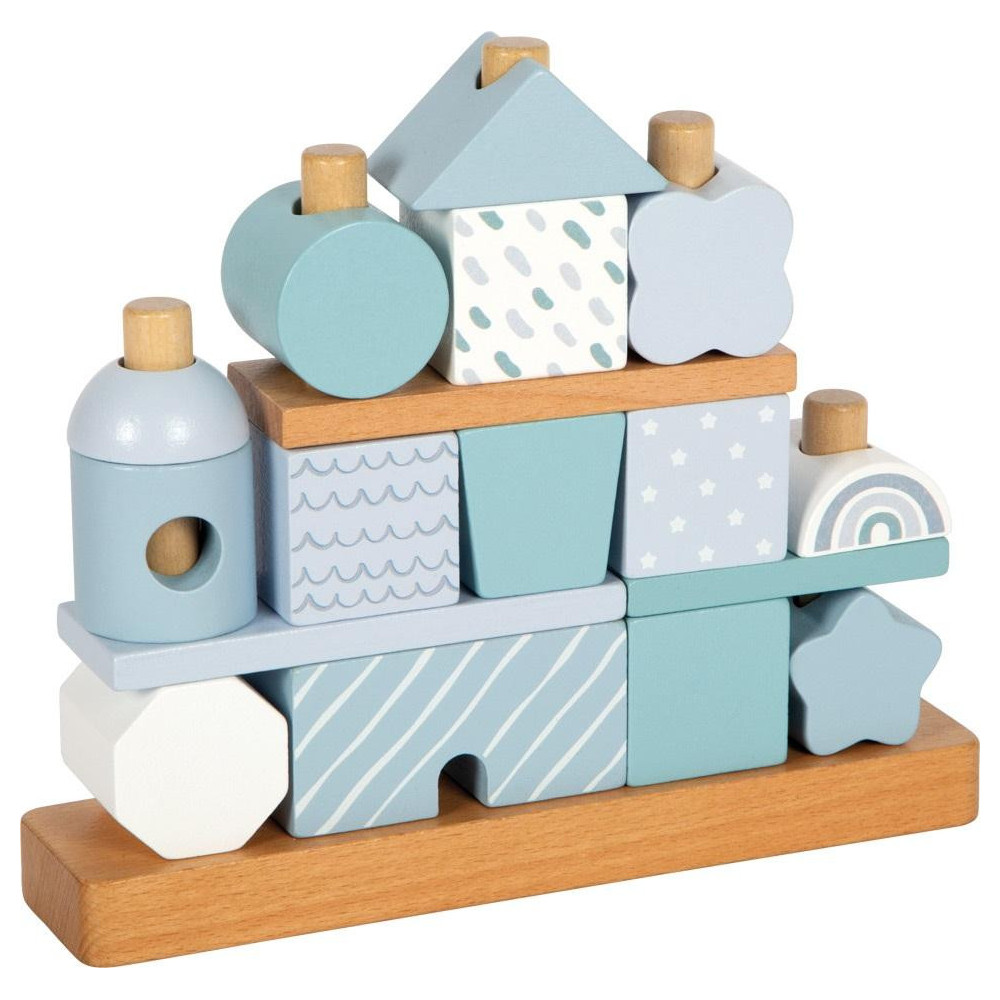 Tento dřevěný stohovací domeček v jemných pastelových odstínech modré s přírodními prvky okouzlí nejen svým designem, ale i variabilitou. Obsahuje 18 různě tvarovaných a zdobených dílků, které děti inspirují k nasazování na dřevěné tyče a vytváření stále nových variant domečku. Při hraní si tak rozvíjejí jemnou motoriku, koordinaci a kreativitu.
