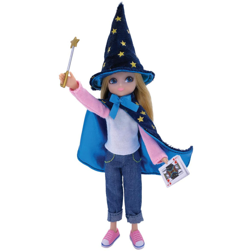 - model kouzelnice zahrnuje růžovo‑bílé tričko, džínové kalhoty, modrý plášť zdobený hvězdami a stejně laděný vysoký klobouk, růžové tenisky, kouzelnickou hůlku a balíček karet