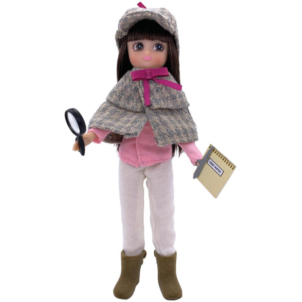 - model detektivky zahrnuje károvaný hnědo‑zelený kabátek zdobený růžovou mašlí a stejně laděnou čepici, růžovou košili, béžové kalhoty, hnědé boty, poznámkový blok, pero a nálepky s otisky prstů