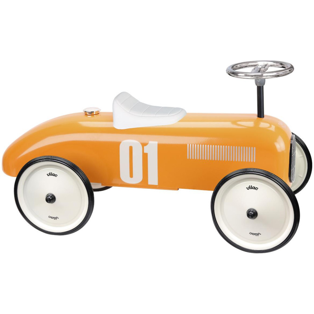 Odrážedlo Vintage ve stylu závodního auta je plně kovové a má oranžovou metalickou barvu. Volant ovládá zatáčení předních kol. Bílé sedadlo je vyrobeno z plastu. Kola odrážedla jsou pogumovaná a zaručují tak tichý chod i na pevném povrchu.