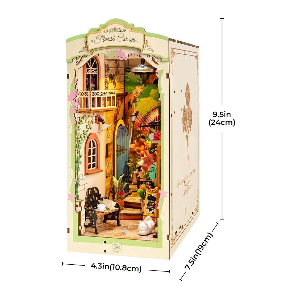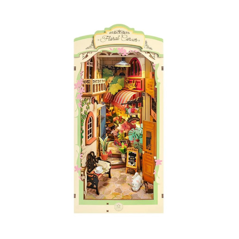 Vytvořte si kouzelnou květinovou oázu mezi Vašimi knihami díky miniaturnímu květinářství. Přeneste se do uličky, ve které můžete obdivovat jemné detaily budov, jako jsou stěny pokryté břečťanem, klenutá okna, propracované dveře a balkón, pruhované markýzy, odpočívající kočka a spousta květin. Příjemné LED osvětlení umocní dojem z tohoto přívětivého květinového koutku a navodí ve Vašem domově atmosféru klidu a pohody. Pozvěte svou rodinu nebo přátele a užijte si zábavné tvoření bez nutnosti použití lepidla nebo nástrojů. Všechny díly skládačky jsou přesně vyřezané, očíslované a lehce do sebe zapadnou, aby výsledek byl stabilní a odolný. Plastová fólie ochrání Váš květinový koutek z horní i přední strany před prachem a nečistotami. Dodáváno s podrobným návodem k sestavení. Hlavní vlastnosti: 164 precizně vyřezaných dílkůsnadná montáž bez použití lepidla a nástrojůrozvíjí logické a motorické dovednostipodporuje trpělivost dětíideální jako dárek nebo jedinečná dekoraceLED osvětlenípodrobný návod k sestavení součástí balenívyžaduje 2 kusy baterií AAA/LR03/AM4 1,5V - nejsou součástí balení