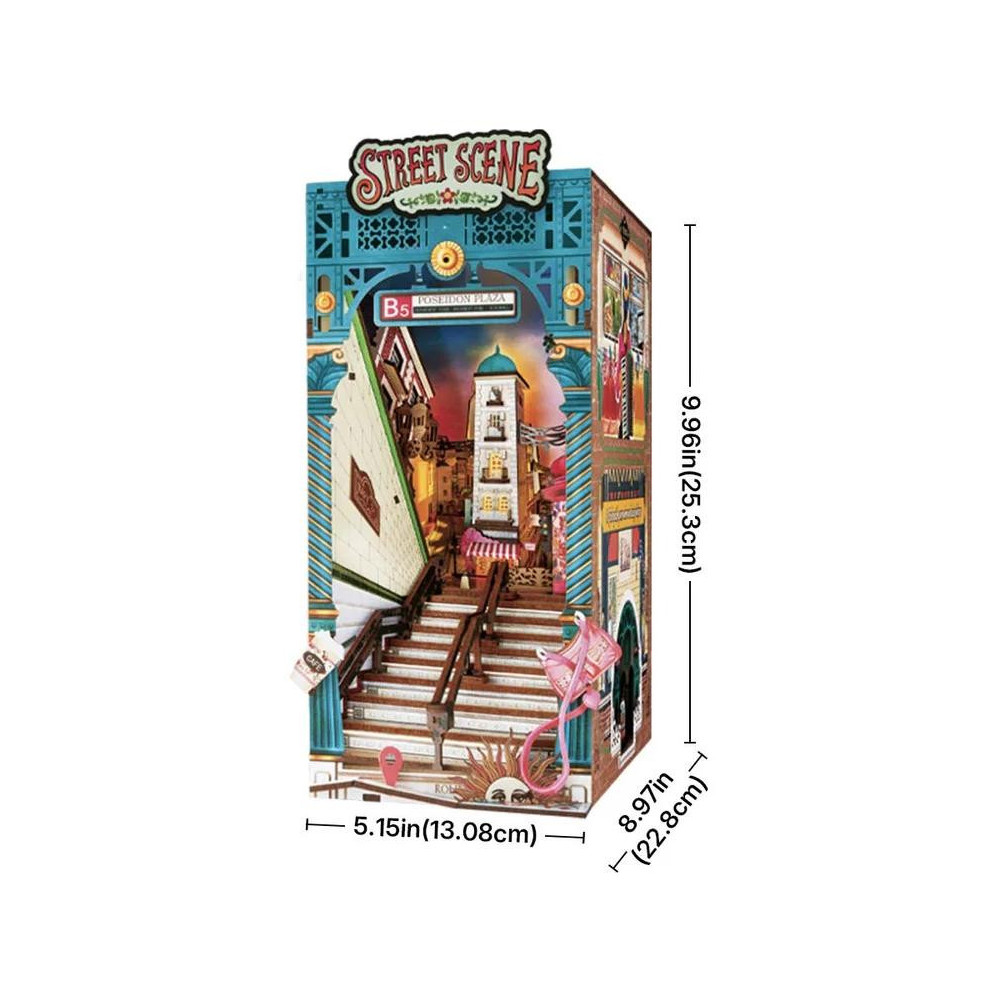 Proměňte svou polici v rušnou městskou ulici. Scéna vyzařuje městskou atmosféru, úzké schody ihned upoutají pozornost a nahoře se otevírá výhled na osvětlené domy, pouliční lampy, dlažbu a jemné detaily chodníků. Spodní část schodiště doplňují drobnosti každodenního života, včetně papírováho kelímku od kávy, růžové crossbody kabelky, které naznačují každodenní rutinu dojíždějících. Pro milovníky cestování a atmosféry města je zde stylizovaný sluneční ciferník a ikona s mapou - připomínka dobrodružství v nové lokalitě. Nepřehlédnutelným překvapením je malé „nádraží“ skryté pod schody a umístěné po straně knihkupectví - objev, který potěší pokaždé, když vložku vytáhnete. Celkový dojem završuje LED osvětlení, které dokáže proměnit scénu ve zlatavý západ slunce nebo pulsující noční město.3D skládačka je skvělý způsob, jak si užít kreativní a edukativní hraní a zároveň vytvořit nádherný model, který se může stát netradičním dárkem či ozdobou interiéru. Skládání 3D skládačky podporuje rozvoj jemné motoriky, prostorového myšlení a trpělivosti. Je to možnost, jak kombinovat zábavu se vzděláváním. Všechny přesně vyřezané dílky do sebe lehce zapadnou bez použití lepidla či nástrojů, aby výsledek byl stabilní a odolný. Skládačka je dodávána v nesloženém stavu, zabalená v krabici s podrobným návodem k sestavení. K napájení slouží 2x AAA /LR03/AM4 1,5 V (nejsou součástí balení). Hlavní vlastnosti: 196 dílkůdoba skládání 4 hodinyvysoká obtížnost sestaveníLED osvětlenísestavení bez použití lepidla a nástrojůvýjimečný vzhledvhodné pro děti i dospělérozvíjí logické a motorické dovednostipodporuje trpělivost dětíideální dárek nebo jedinečná dekorace napájení pomocí 2 baterií AAA /LR03/AM4 1,5 V (není součástí balení)