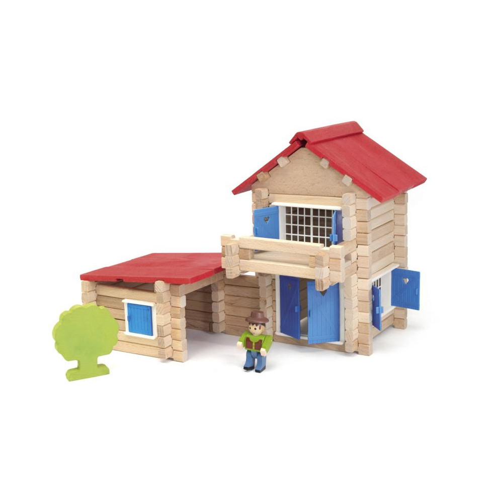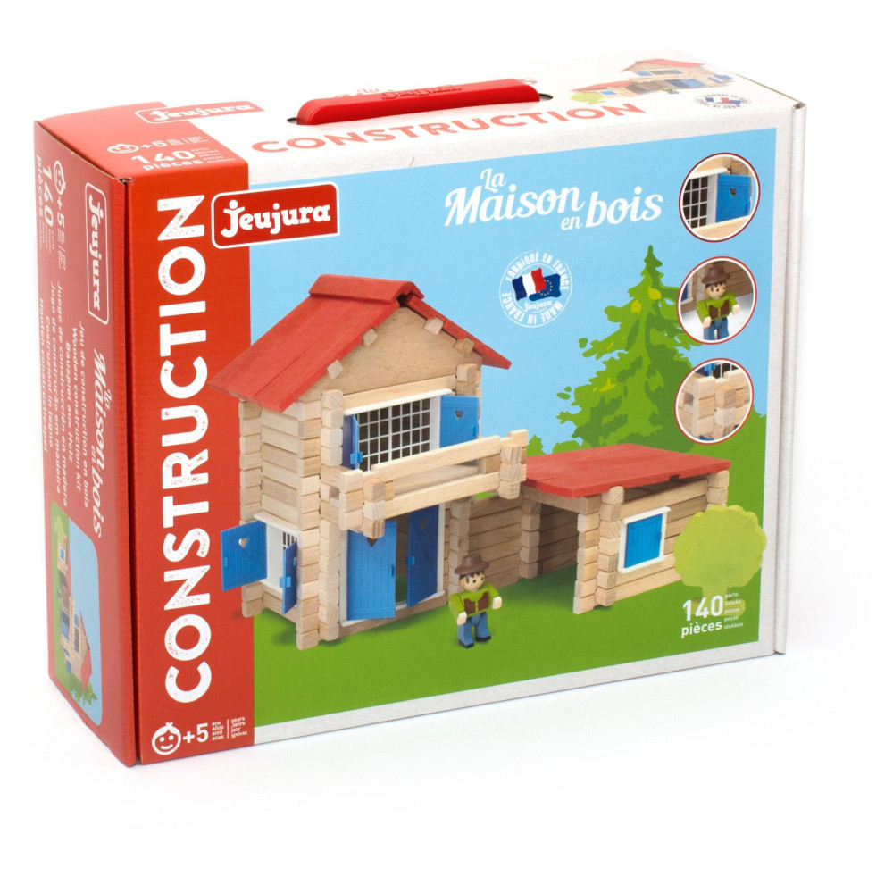 Dřevěná stavebnice domečku ke hrám s figurkami rodin rozvíjí fantazii a stane se ozdobou dětského pokoje. Stavebnice Jeujura Constructions mají dlouhou tradici a patří mezi klasické francouzské hračky. Nabízí série tématicky věnované chatám, domkům a farmám, ale také divokému západu a středověku. Dají se mezi sebou volně kombinovat a k řadě z nich je také nabízeno příslušenství, figurky a vozidla. Jsou vyráběny ve Francii, z masivního bukového a borovicového dřeva francouzského původu. Dílky stavebnic jsou ošetřeny výhradně za použití barev a laků na bázi vody. Každá sada je balena v praktickém lepenkovém kufříku potištěném rostlinnými inkousty a součástí balení je snadno pochopitelný návod.