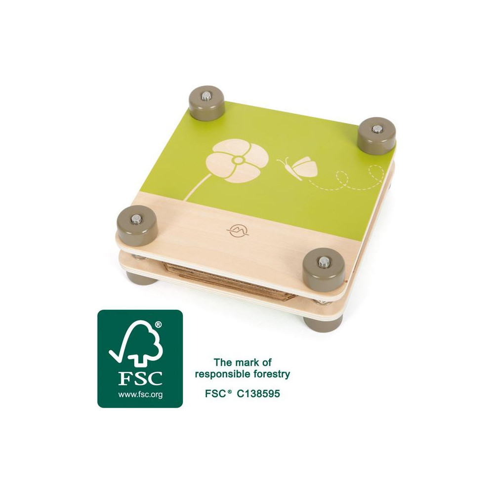 Tento lis na květiny vhodný pro děti je vyrobený z pevného dřeva s certifikátem FSC® . Je vybaven čtyřmi nožkami a obsahuje 8 kartonových listů a 16 lisovacích listů. Díky tomu nabízí dostatek prostoru pro sušení a zploštění listů, okvětních plátků a květin. Jednoduchým vložením nasbíraných přírodních pokladů mezi vrstvy papíru a lepenky je snadno uchováte. Čtyři kovové šrouby a matice umístěné v dřevěných kroužcích usnadňují dětem jeho používání tím, že jim umožňují silný úchop a dostatečnou sílu ke stlačení dvou dřevěných panelů k sobě. Tento dřevěný lis na květiny dělá skvělý vizuální dojem také svými zaoblenými hranami, kvalitním zpracováním a atraktivním designem v kombinaci s moderními zelenými barvami.