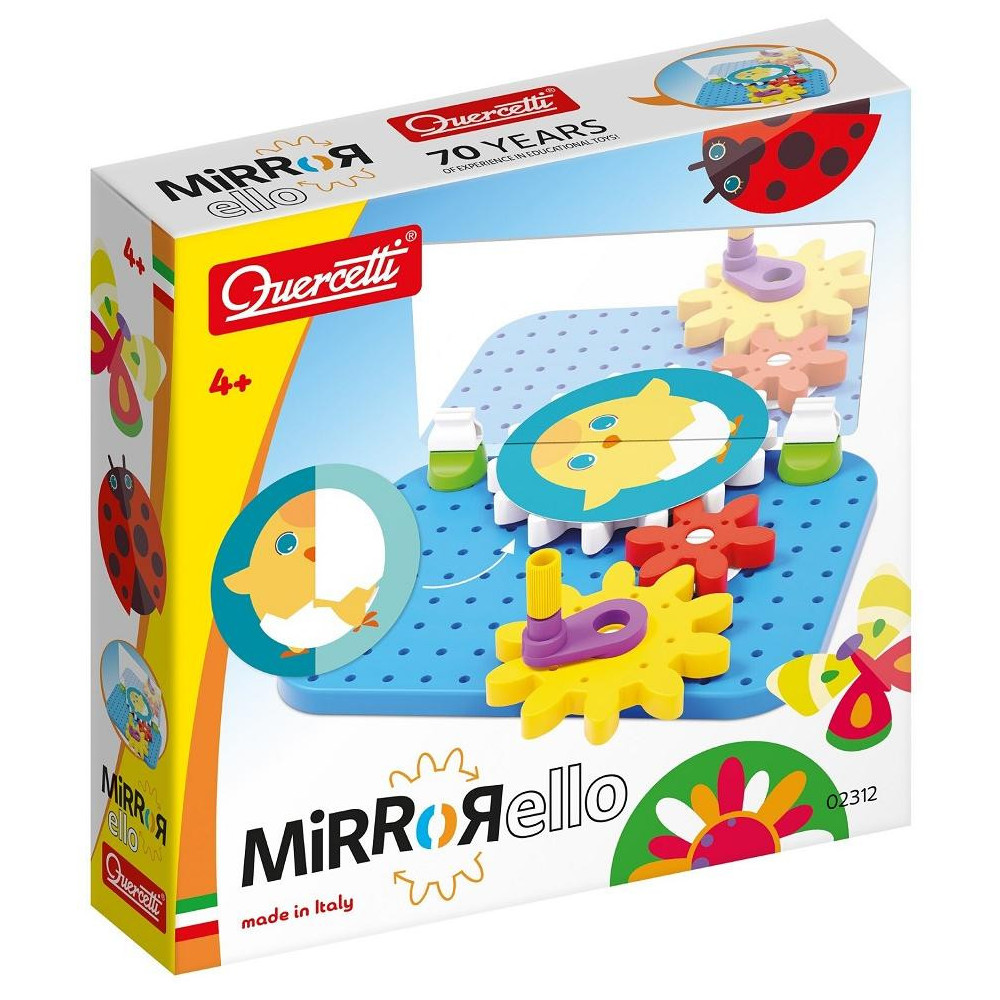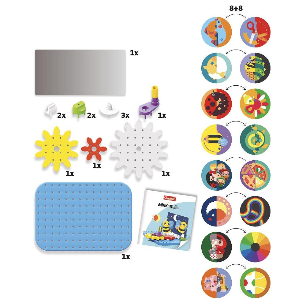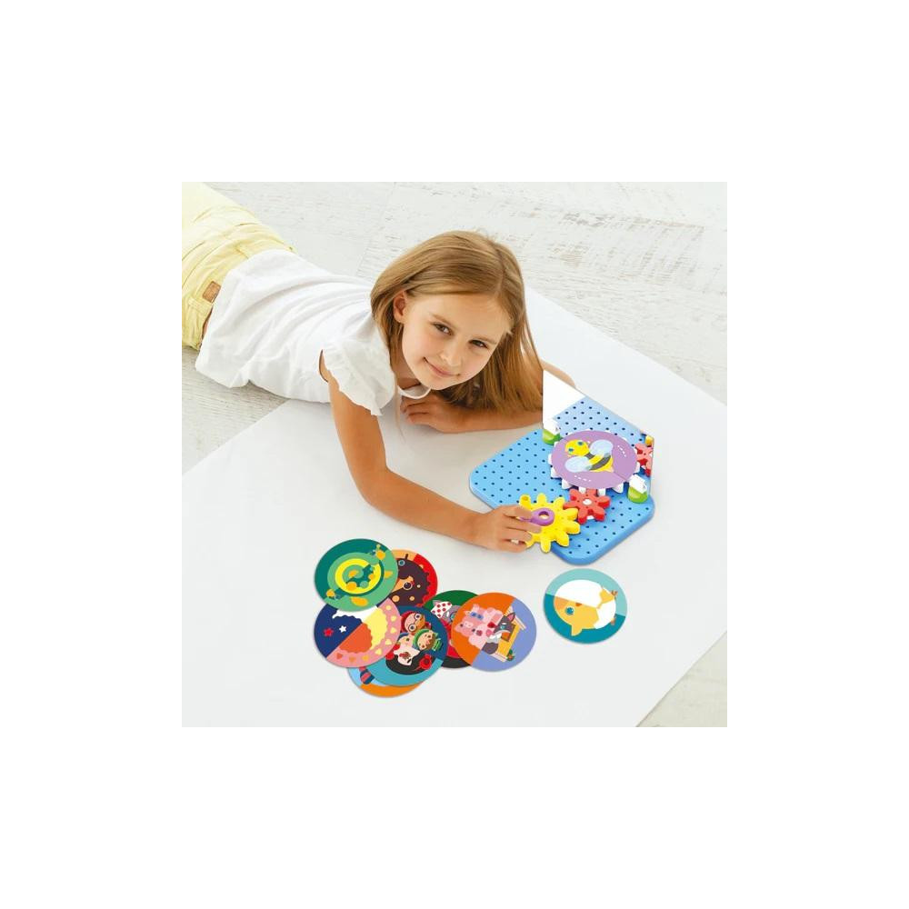 Mirrorello je hravé a kreativní dobrodružství, které promění každé otočení ozubených koleček ve vizuální kouzlo! Otočením kliky se ilustrované kotouče magicky dávají do pohybu a vytvářejí překvapivé a stále nové obrazy. Mirrorello pomáhá upevnit jemnou motoriku, tvořivost, fantazii a kombinační myšlení.