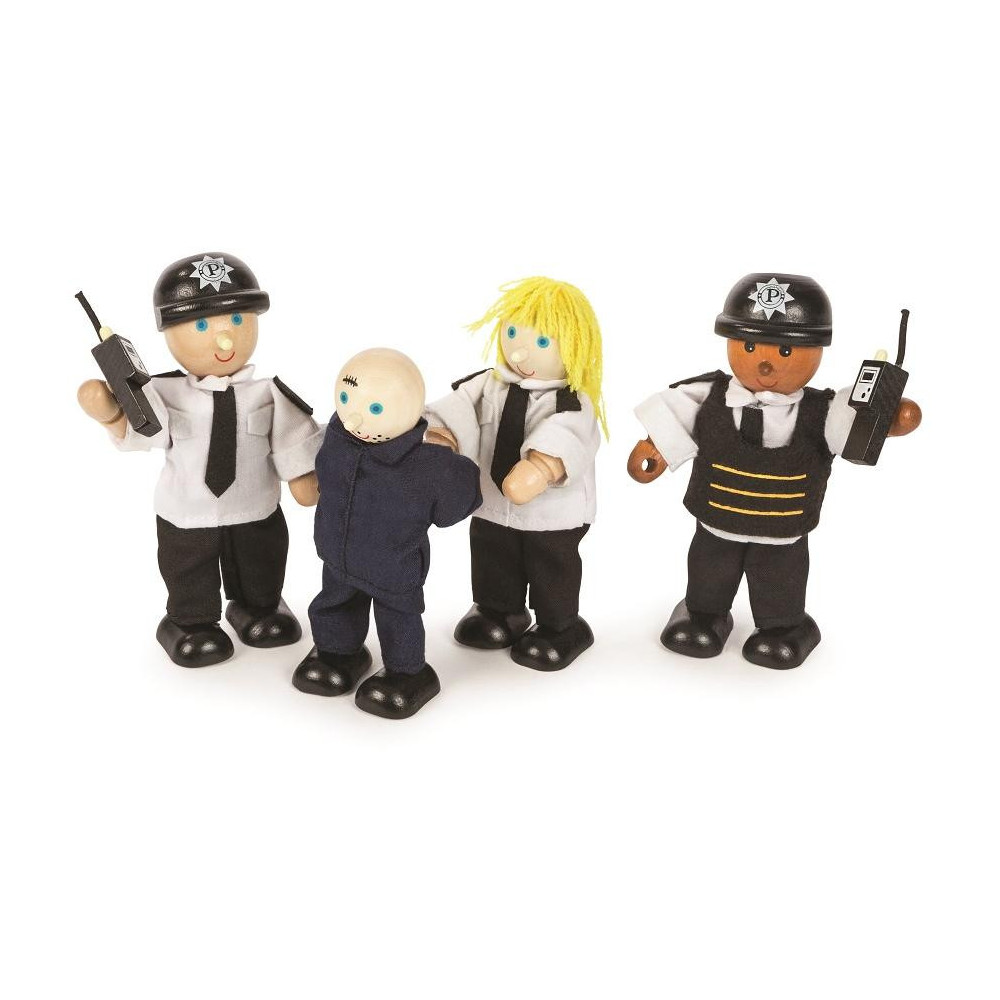 Set tří postaviček policistů (a jednoho lupiče), kteří jsou připraveni k akci, zapnout sirény, šlápnout na plyn a dohonit zloděje! Nadšení a připraveni ke službě, postavičky policistů jsou oblečené do bezpečných uniforem, mají ohebné a nastavitelné horní i dolní končetiny a každá z nich dokáže samostatně stát či sedět. Krásné postavičky mají také své vysílačky, kterými mohou komunikovat mezi sebou nebo se stanicí. Podporuje kreativní a představivou hru. Rozvíjí koordinaci ruka-oko, jemnou motoriku a zručnost. Vyrobeno z kvalitních materiálů z odpovědných zdrojů. Odpovídá evropské bezpečnostní normě.