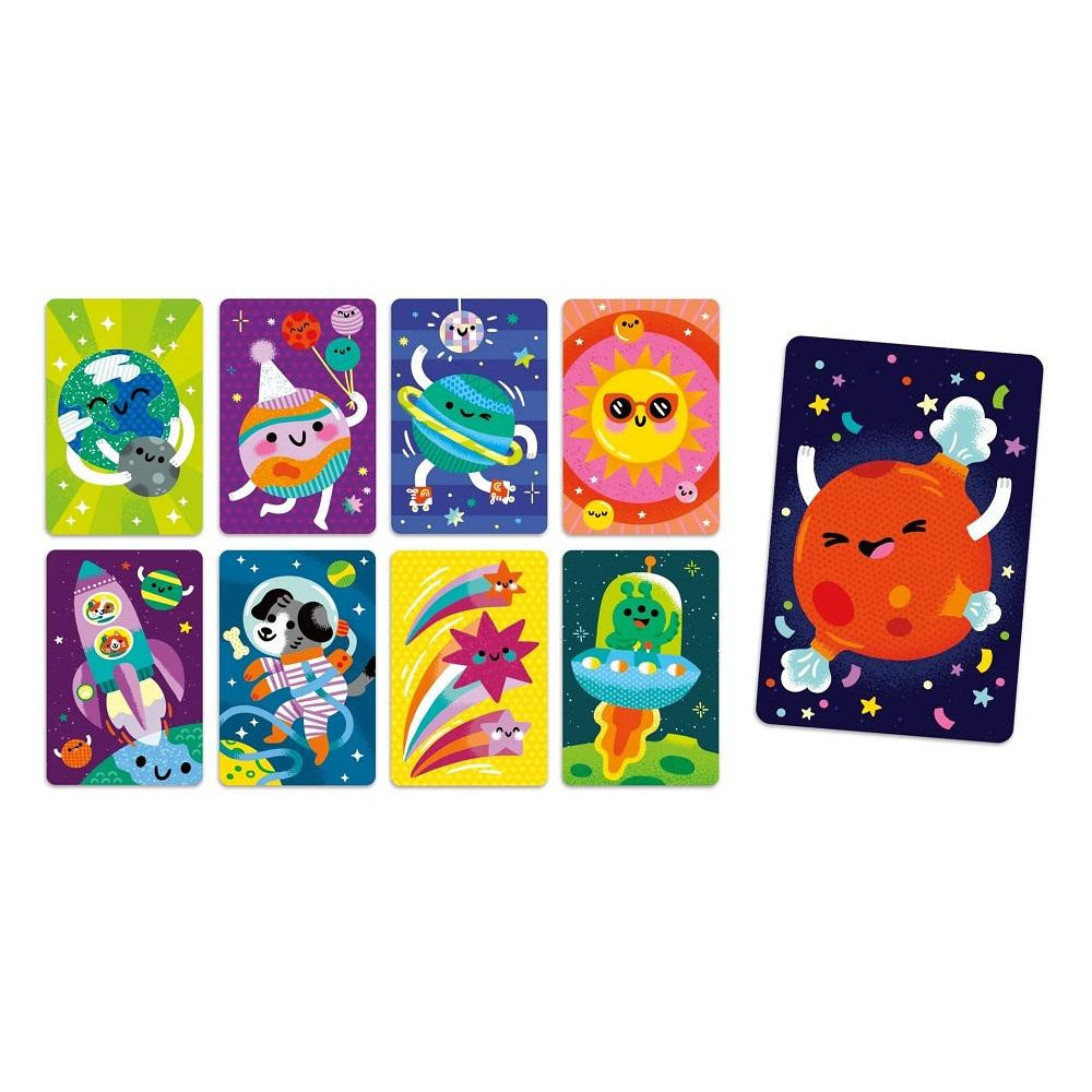 Solar Snap! je rychlá karetní hra s rychlými reakcemi, kde se hráči snaží být první. Kdo si všimne dvojice shodných karet zakřičí „Snap!“ Hrací karty zdobí oblíbené téma vesmíru. S kartami lze hrát nejen varianty hry Snap!, ale také kvarteto, nebo i pexeso. Užijte si zábavu v rodinném kruhu, ať už na cestách, nebo doma za deštivých dní. V našem sortimentu karetních her naleznete Snap! i s mnoha dalšími atraktivními motivy.
