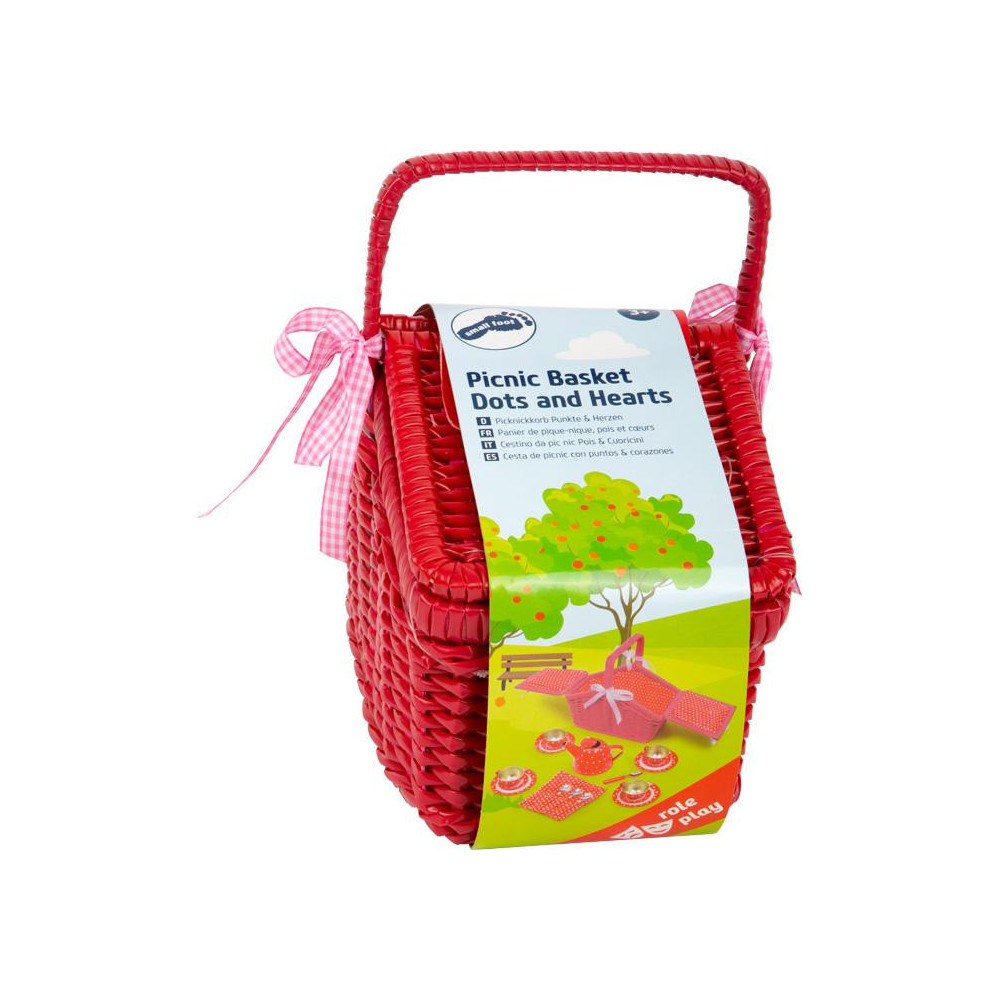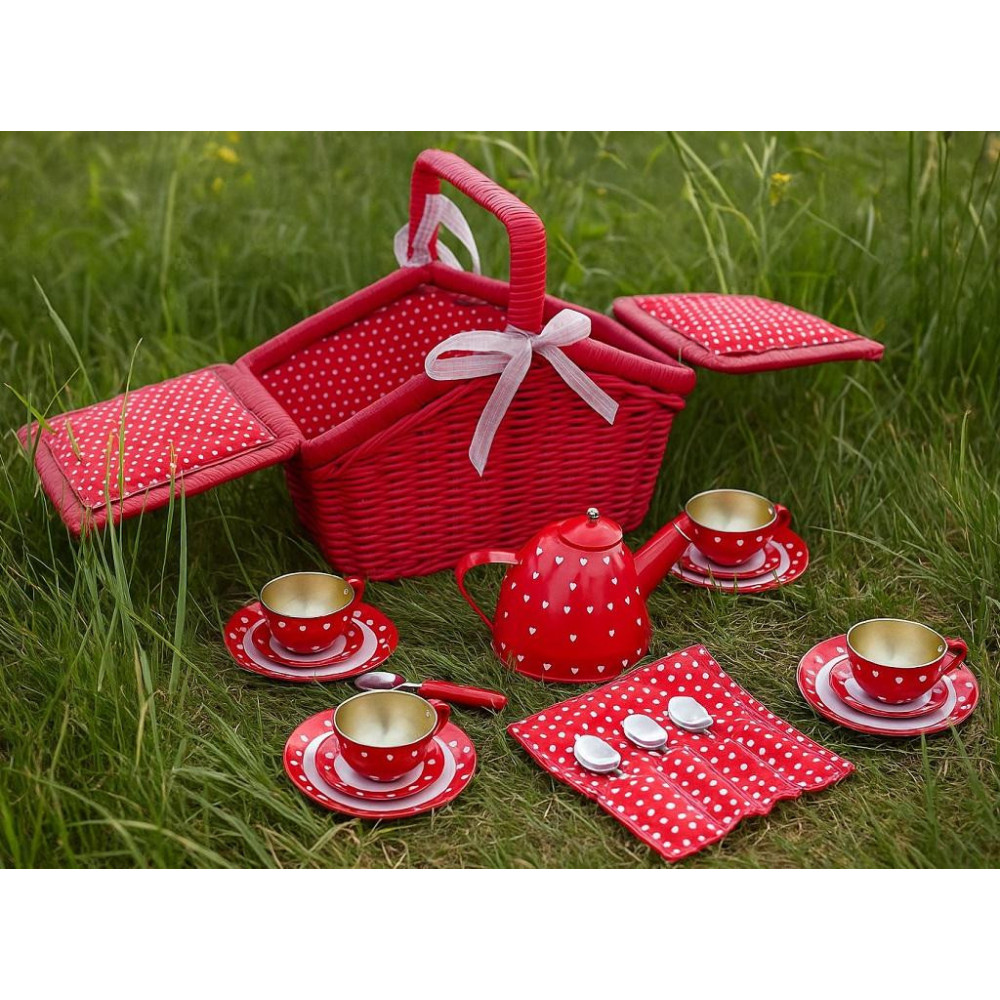 Tento proutěný košík obsahující plechovou čajovou soupravu s motivem srdce si můžete vzít na každý čajový dýchánek! Koš má pásky se suchými zipy, je lemovaný puntíkovanou látkou a zdobený malými stuhami.