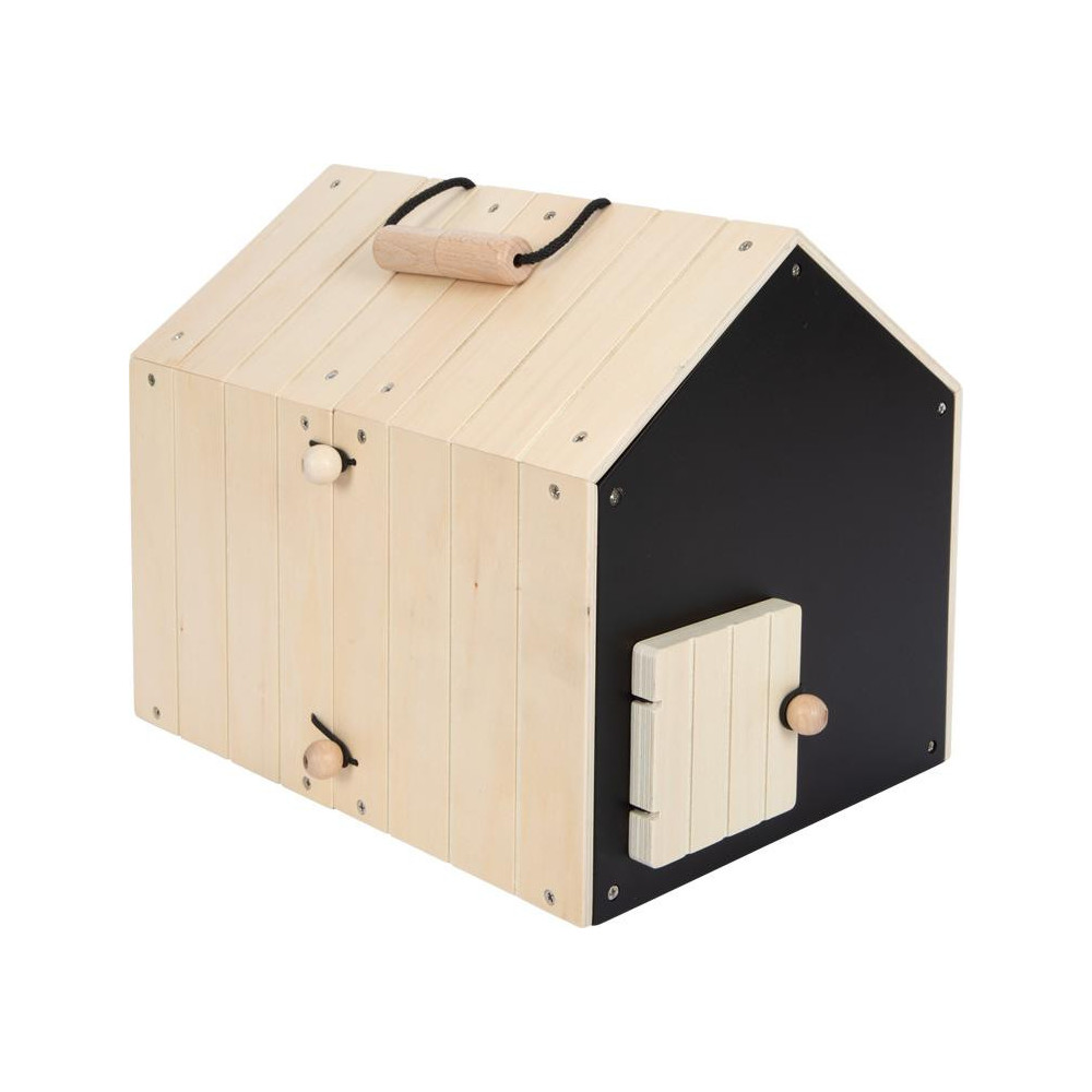 Roztomilý přístřešek a v něm ještě roztomilejší čumáček! Králíkárna ze stabilního dřeva (kterou lze použít i pro přepravu) se skládá ze dvou malých boudiček, jenž lze za pomoci smyček propojit. V jedné polovině může plyšový králík nerušeně spát a na druhé straně se přes síť může rozhlížet po svém okolí. K boudám lze připojit dva pletivové ploty a vytvořit tak venkovní výběh. Díky četnému příslušenství je výběh pro králíky okamžitě připraven ke hře a poskytuje realistické situace při hraní rolí. Pokud děti ještě nemohou mít skutečného mazlíčka, pak je tato sada dokonalou alternativou! Děti mohou totiž trénovat důležité sociální a emocionální dovednosti při předstírání péče o zvíře. Balení obsahuje plyšového králíka, smetáček, misku, mrkev ze dřeva a plsti, kousek salátu a pár plstěných bobků. Černou stěnu na zadní straně boudy lze za pomoci křídy popsat.